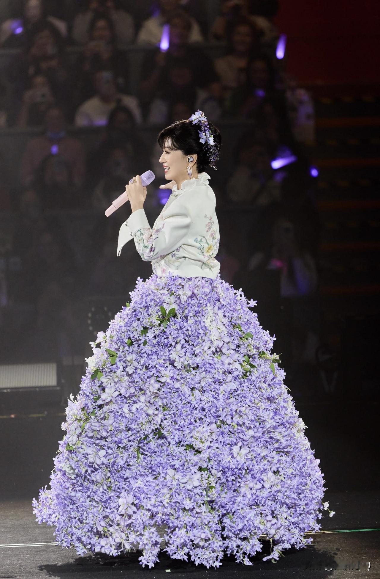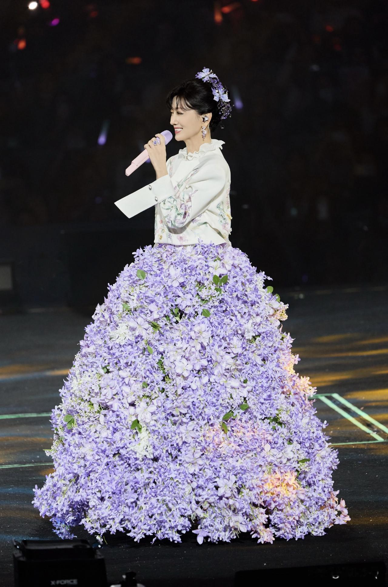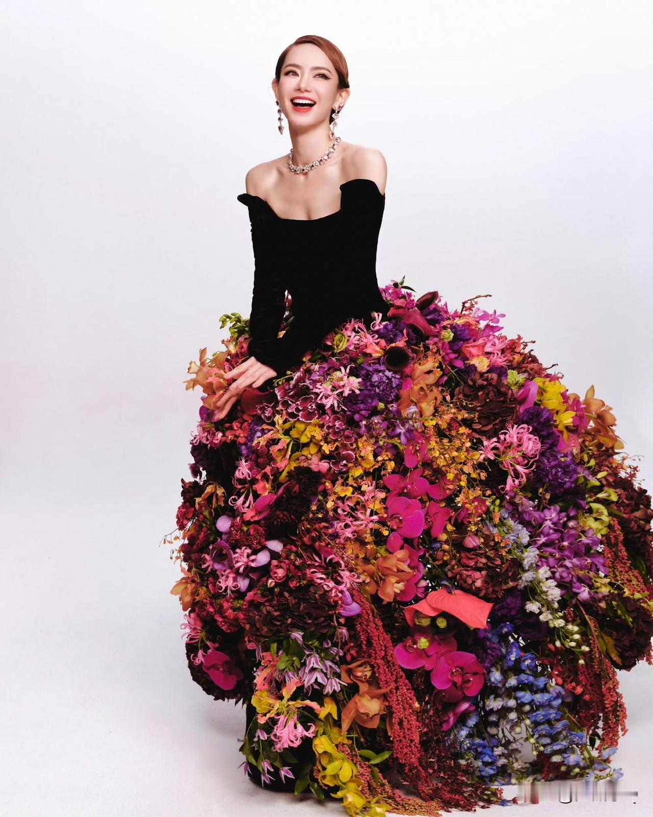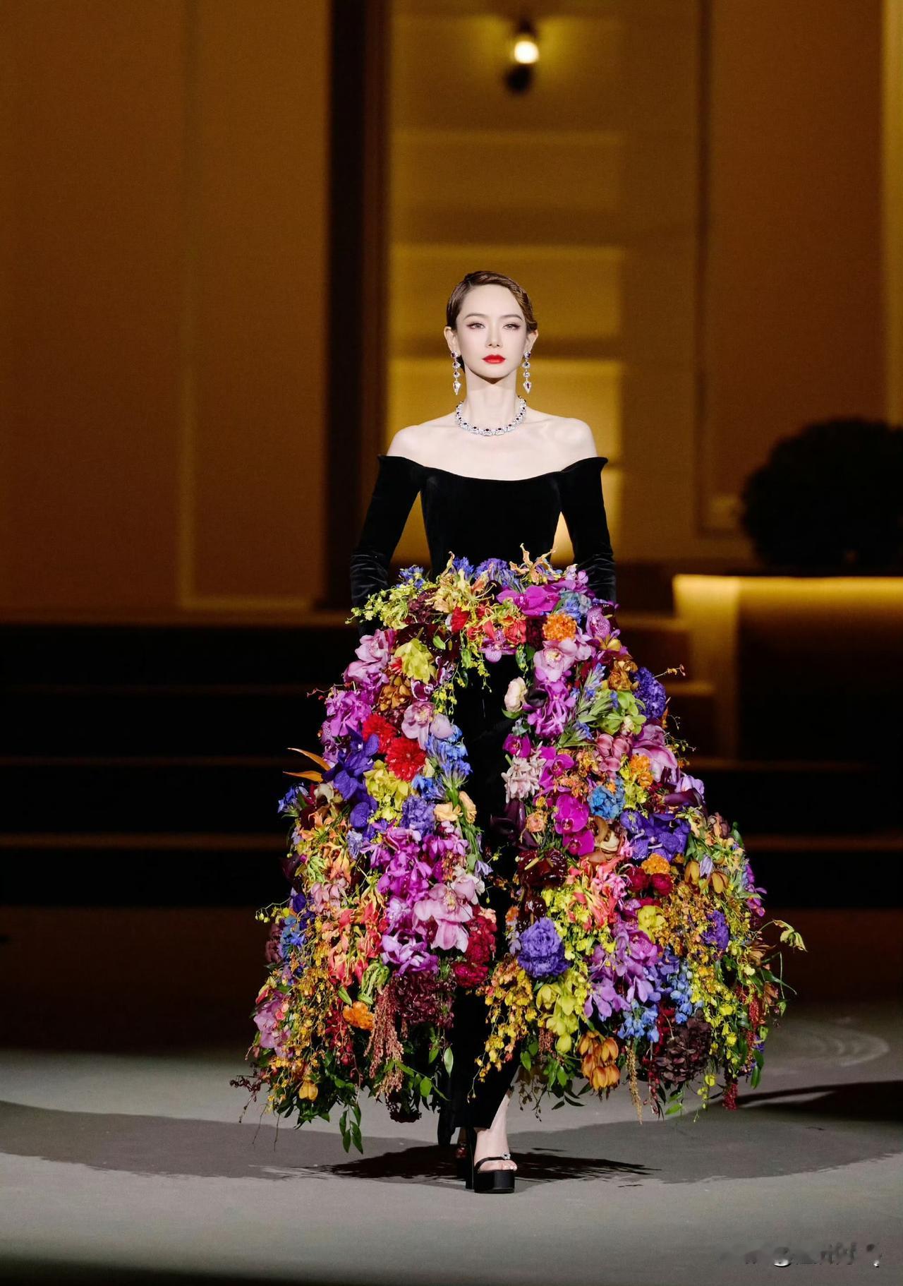 赵雅芝的裙子和戚薇的裙子有异曲同工之妙,都是里面搭建骨架,在裙子外面铺设花朵,把整个花园搬到身上。