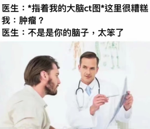 医生:指着我的大脑ct图,这里很糟糕 我:肿瘤 ? 医生:不是,是你的脑子,太笨了
