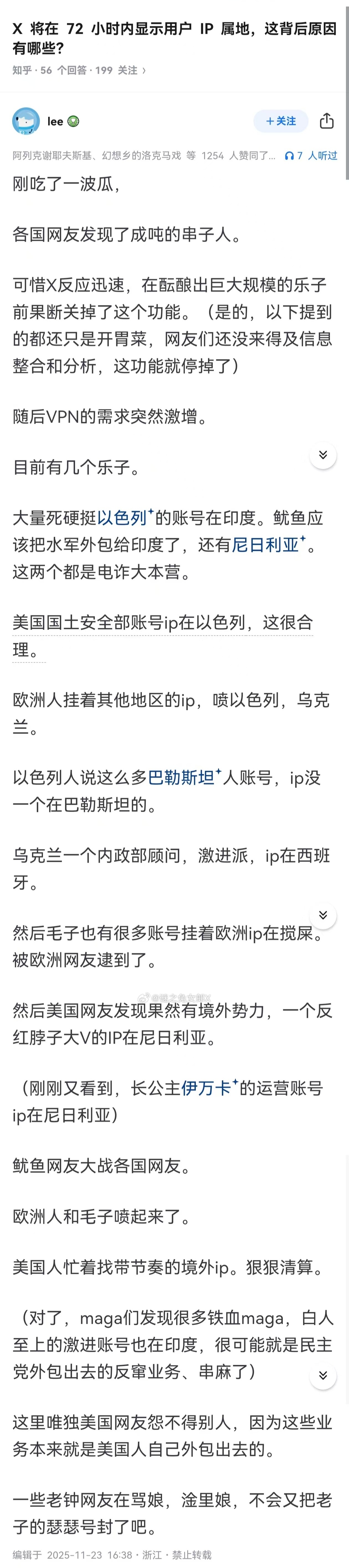 第一个想到app显示账号所属地的真的是天才。X的这个更加严格,用没用梯子都能够判断出来。以为是各国网友畅所欲言,原来是水军大战,各国网友吃瓜。