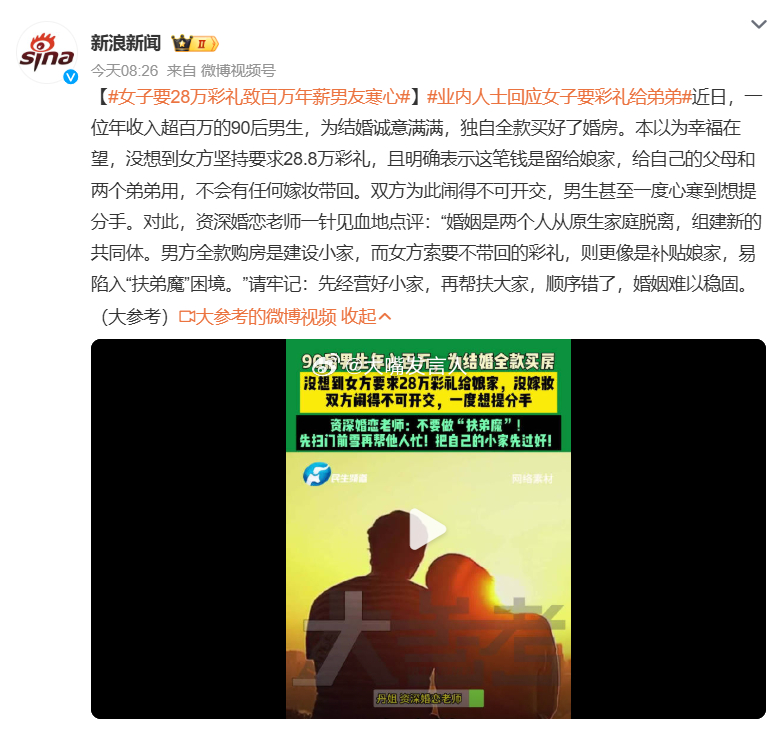 建议男生接纳条件,送出28万元彩礼给女方,并接纳对方的两个弟弟否则这段感谢破裂,这样的女生就去折腾其它男生了,,