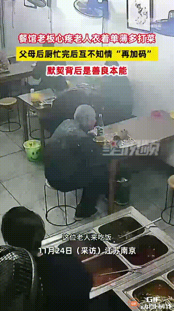 江苏南京一家餐馆内,一位老人走进店里要吃饭,女店主见老人年龄大了,而且身上的衣服也很单薄,于是就默默地给他多打了一点菜,老人也没发觉,坐下来就开始用餐。 之后女店主的妈妈出来见状,也是十分心疼老人,便主动又给老人加了菜,而过了几分钟后,女店主的爸爸出来见状,也是觉得老人很不容易,于是再次让女儿给老人加菜。 女店主得知父母的反应后,心里觉得非常感动,因为她的父母在互相不知情的状况下,都选择主动帮老人加菜,这是一种默契,也是一种善良的本能。 网友看完这段视频,都觉得这名女店主一家三口的做法真是太暖心了,看见一位年龄大且衣着单薄的老人进店吃饭时,他们都不约而同地表现出了同一种反应,那就是对老人十分同情。 女店主虽然没有说什么,但却默默地为老人多打了一些菜,而她的爸爸妈妈也是如此,发现老人不容易后,也都主动帮忙加菜,虽然这些菜不值多少钱,但却是一种心中有大爱的体现。 不得不说,这一家三口都是心地非常善良的人,同时也很有默契,相信这就是最好的家庭氛围吧,父母的善良让女儿耳濡目染,所以一家人都十分愿意帮助别人,他们的举动不仅温暖了老人,也温暖了这个社会,让人感受到了美好。大家怎么看呢?