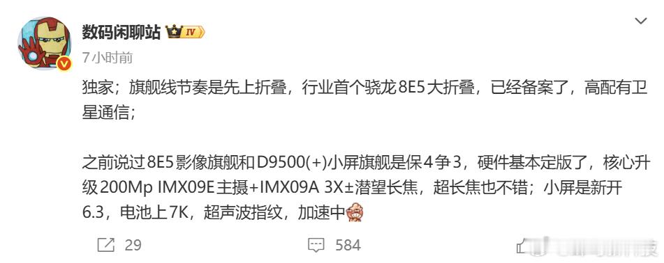 【OPPO Find N6折叠屏备案,全球首款骁龙8E5大折叠】据博主数码闲聊站表示,OPPO Find N6已完成备案,将成为首款搭载骁龙8E5(第五代骁龙8至尊版)的折叠屏手机。新机内屏8.1英寸、外屏6.6英寸,电池容量超6000mAh,后置索尼LYT808主摄+3倍潜望长焦+多光谱传感器,支持卫星通信(高配版)、侧边指纹、无线充电及满级防水。