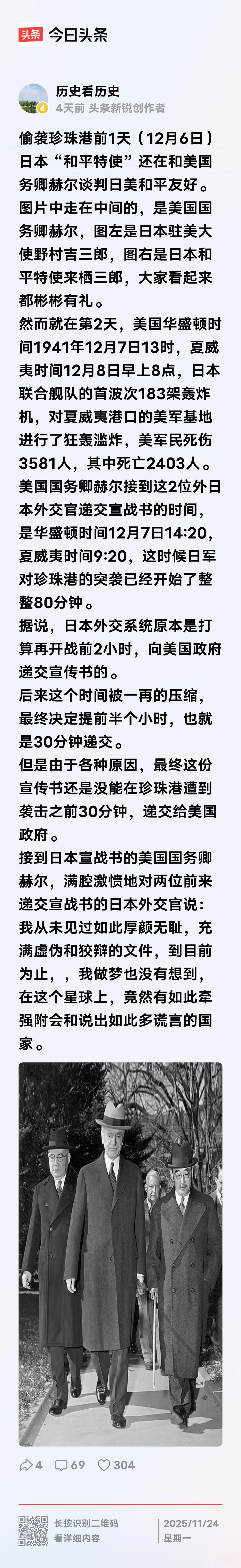 1941年的美国国务卿是赫尔,照片里位于中间的这个男子就是他,在他两边的是两头狼,一个是野村吉三郎,一个是来栖三郎,这三个人走在一起,表面上看一团和气,非常的融洽,可是这两头狼是有狼子野心的,头一天弹的还挺欢,第二天日本鬼子就袭击珍珠港了,但是照片中的日本鬼子,沉定自若,根本就看不出宇们还有这一手,历史的教训告诉我们,小日子一贯不宣而战,防不胜防!