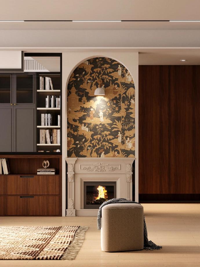 家居设计|法式复古焦糖色复古沙发氛围感拉满,拱形门洞 + 罗马柱暗藏法式浪漫,壁炉花纹墙点睛