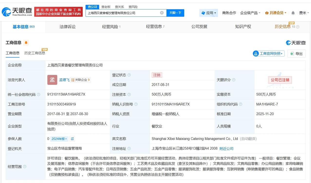 西贝旗下上海一餐饮管理公司注销 天眼查工商信息显示,近日,上海西贝麦香餐饮管理有限责任公司登记状态由存续变更为注销。 该公司成立于2017年8月,法定代表人为孟德飞,注册资本500万人民币,经营范围包括餐饮服务、餐饮管理、会议及展览服务等。股权全景穿透图显示,该公司由西贝餐饮集团旗下北京贾国龙空气馍餐饮管理有限公司全资持股。 天眼查信息: