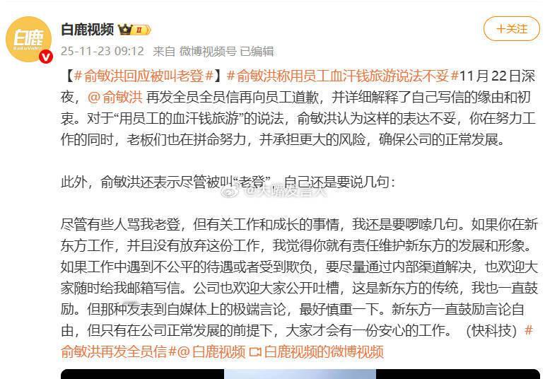 一边称“公司欢迎大家公开吐槽”,一边又说“发表到自媒体上的极端言论,最好慎重一下”说到底,就是你对员工的言论,有最终定性权呗,员工的言论是否极端,你老俞有最终解释权、定义权你提前定义一下,什么叫“极端言论”随口不尊重女性、事后去妇女报公开道歉,是你吗? 时间长了,网民会发现网上不只是一个老登、嬉贝,,