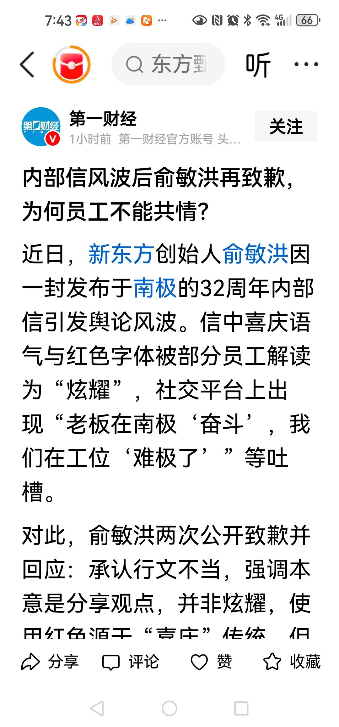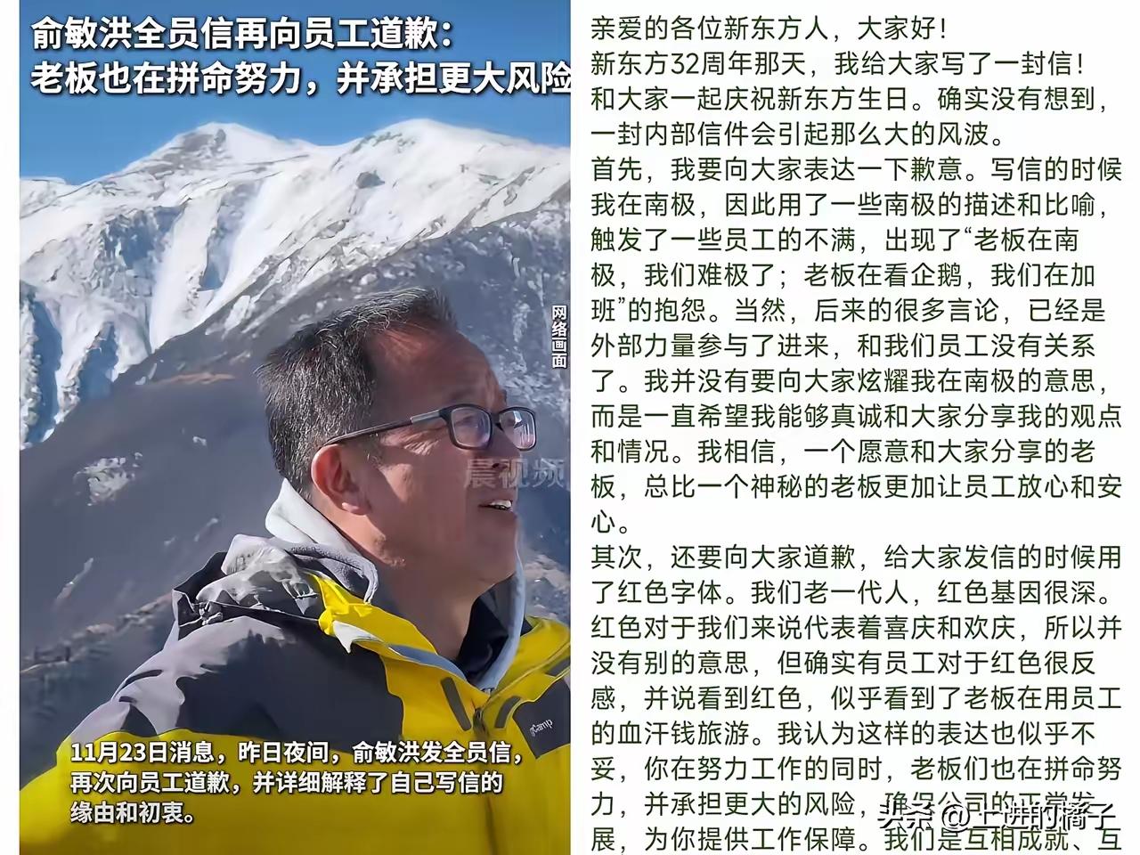 内部信风波后俞敏洪再致歉, 老板旅游,关你员工X事,你与老板之间并非合作关系,只是老板出钱请你做工,如此而已。 老板不必道歉,更不必一再致歉,道歉也是猫哭老鼠,要老板共情员工,老板与员工本就是两类人。 有本事你去当老板,当什么员工,你当员工说明你没能力当老板,没能力当老板就闭嘴,世界永远是强者的世界。 老板们的奢侈,你们只看见冰山之一角,不必唱任贤齐,我现在很受伤,很受伤。 老板享受南极,你在牛马加班,换一只眼看,老板的洋洋洒洒之作,难道不正是激励着你,有一天你也可以把别人当作你的牛马吗? 那天是不是也可以,在南极的天空下,读着俞敏洪的字,“此刻,我正站在南极的冰雪世界中。四周是浩瀚的洁白、翡翠般的冰山和无边的宁静。冰川在阳光下闪烁着迷人的光芒,仿佛在无声地诉说着时间的力量与坚守的意义。