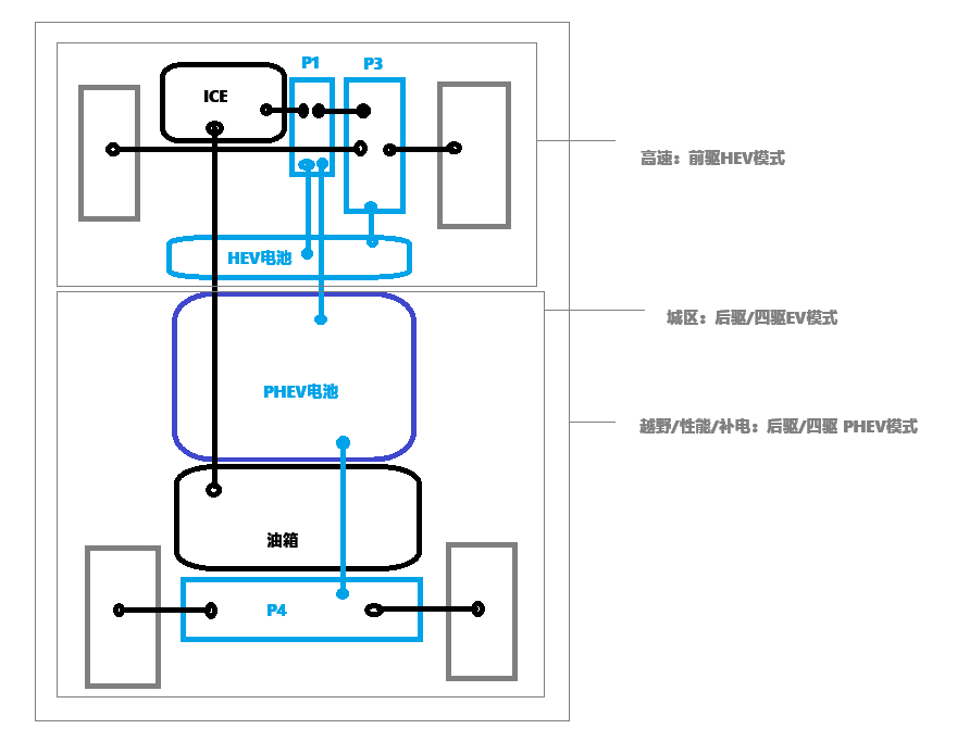 开个脑洞——🔻双电池HEV/EV/PHEV三合一动力系统🔻小电池是高放电倍率HEV电池,大电池是主流PHEV电池🔻前轴做HEV,后轴做EV,整车还是PHEV1️⃣高速用hev模式,纯用油,适合长途旅行,留大电池在城区用电2️⃣城区用EV/PHEV,纯用电,省钱3️⃣越野/性能/保电/补电用PHEV模式,保证动力