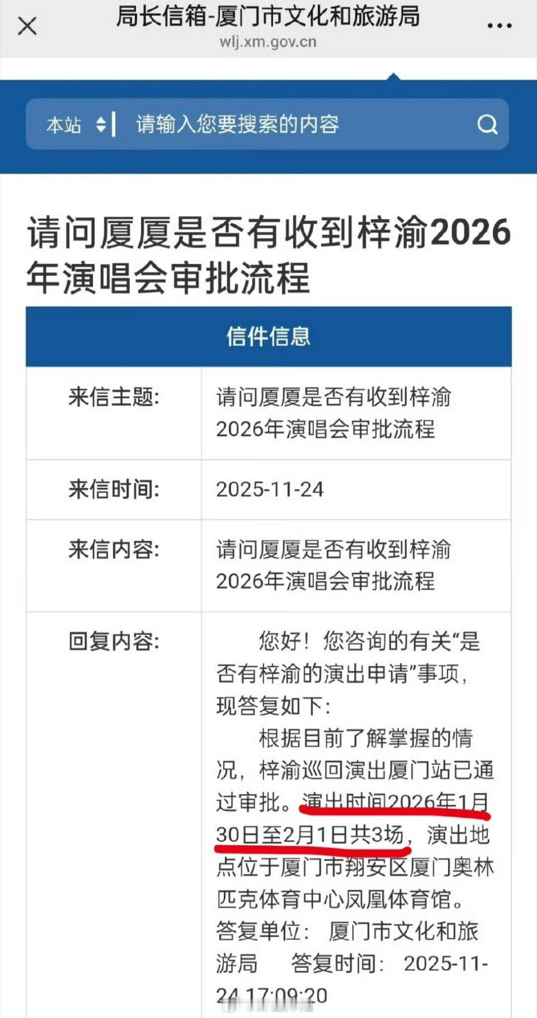 梓渝的厦门演唱会审批通过了,一月三十号到二月一号,连开三场,梓渝这也是很猛啊,第一次开演唱会就连开三场,得是巨肺铁嗓才能撑住