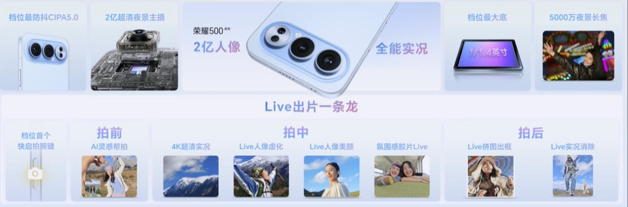不知道现在大家对于荣耀的影像是什么印象,其实从Magic8开始,真的做得很好了。 特别是人像,现在其实挺离谱的,AI参与非常多,其实我觉得是普通人更喜欢的风格。所以荣耀500的人像,live真的是无需担心,能打的。