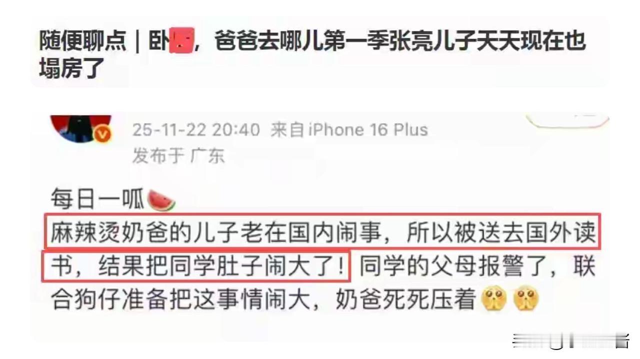 张亮儿子,被爆大瓜。 李湘女儿王诗龄,刚晒完小时候照片,网友觉得温情脉脉,没想到,同期参加《爸爸1》的天天,就被网友爆出大瓜,在国外留学的他,疑似搞大女同学肚子,目前,女方父母已经报了警,信息量之大,令人咋舌。[抠鼻] 该网友虽然没有指名道姓,但提到了“麻辣烫奶爸”,不少网友立马想到张亮。 目前,张亮儿子天天,就在国外留学,前几天,刚过完18岁的生日,个子已经快1米9,和爸爸张亮差不多,3年前,才15岁的天天,就被网友爆出早恋,和女同学关系亲密,疑似发生关系。 被网友骂上热搜后,张亮立马把儿子严格看管起来,带他走秀、演话剧,还送出国读书,谁能想到,如今又被爆出来这事。 如果爆料是真的,只能说太炸裂了,孩子不省心,父母也太操心了。 不少网友感慨,星二代太成熟了,吴尊女儿也才15岁,也被爆出早恋,其实,不是星二代早熟,而是他们行为被放大了,作为公众人物,不仅要给大众做好榜样,也要教育好孩子。[泣不成声]