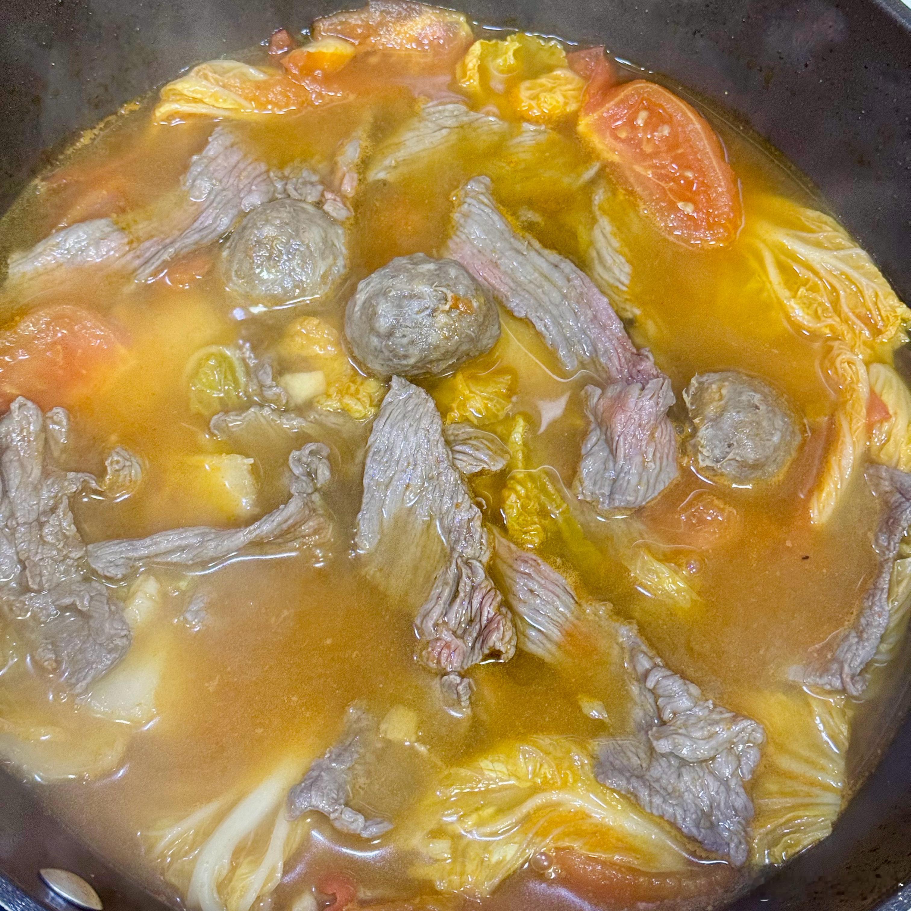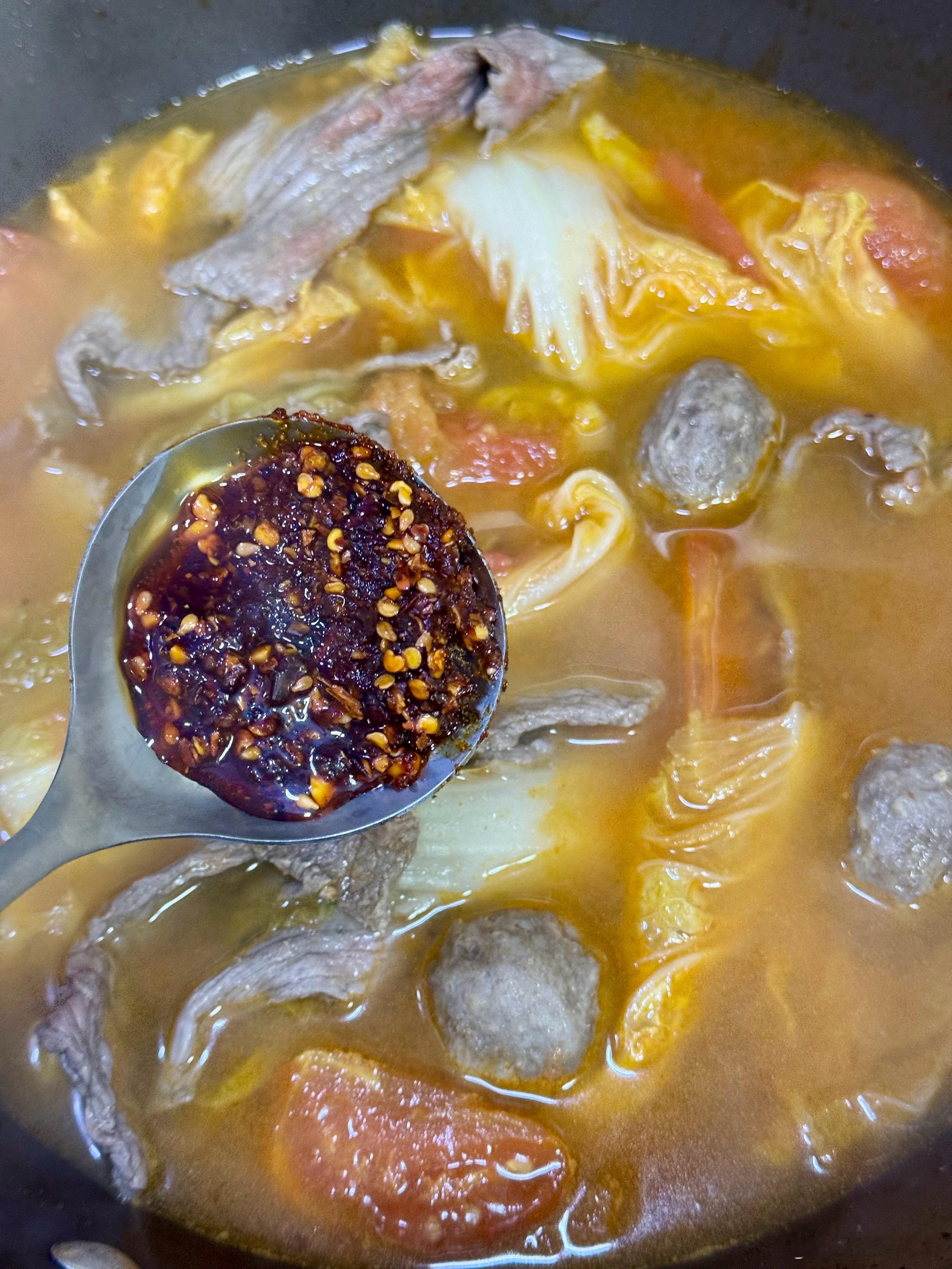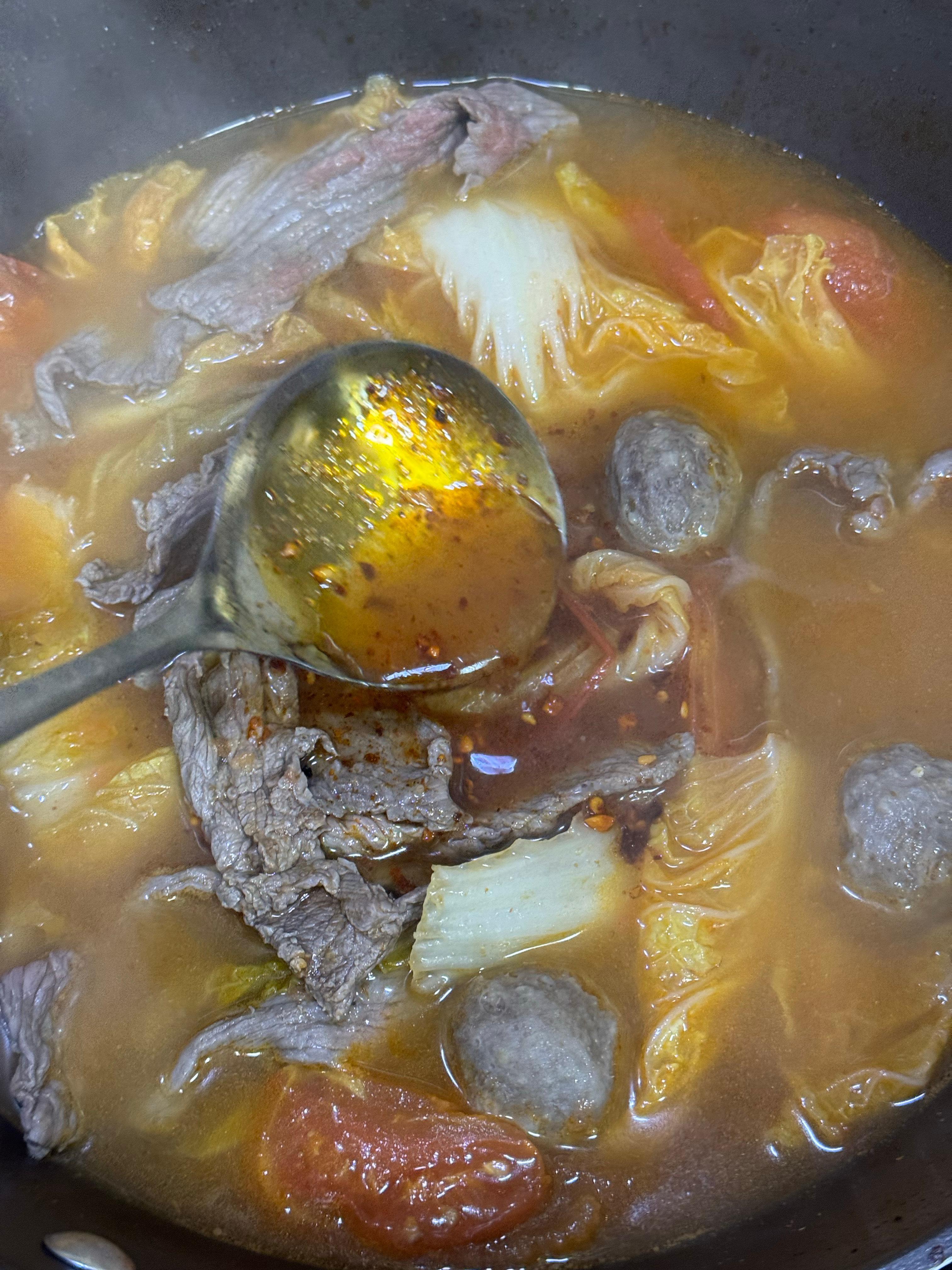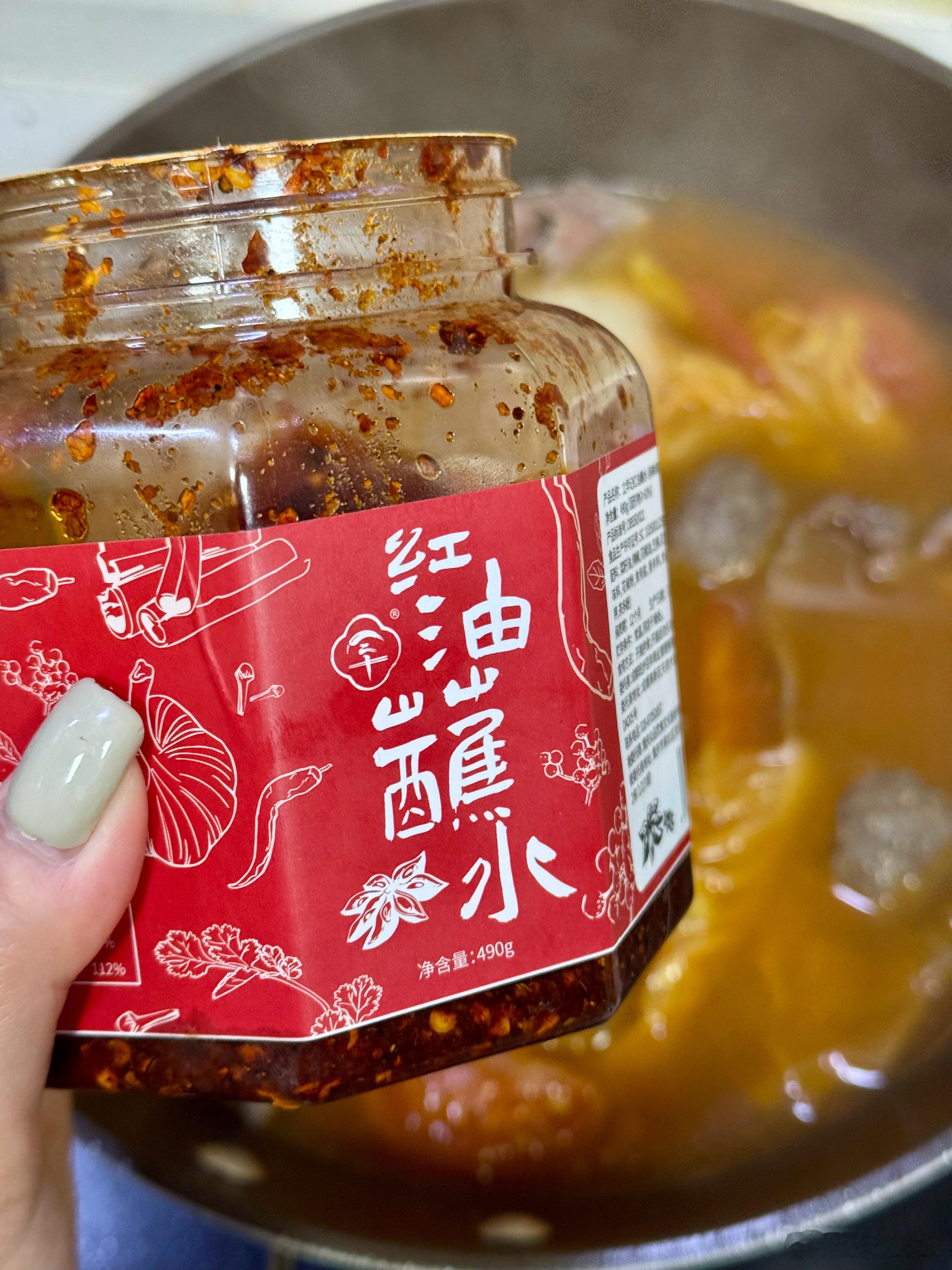 每天最撇脱的酸汤一锅出,把喜欢的各种蔬菜肉放里面煮就行了,我最喜欢娃娃菜+牛肉片的搭配,最后再加一勺油辣子,汤都能喝完,喝完也没事,汤底也没啥热量