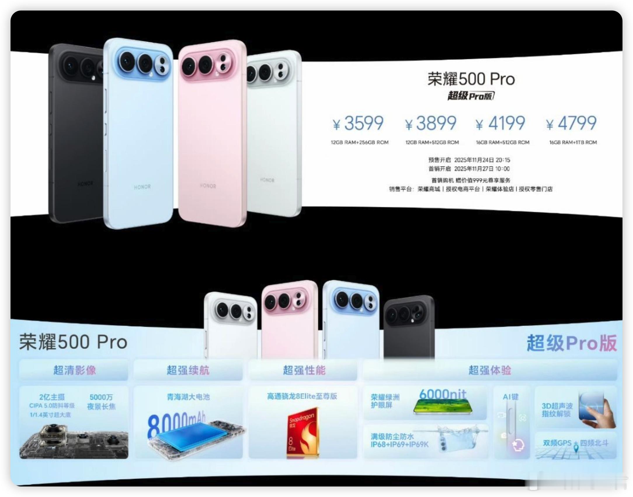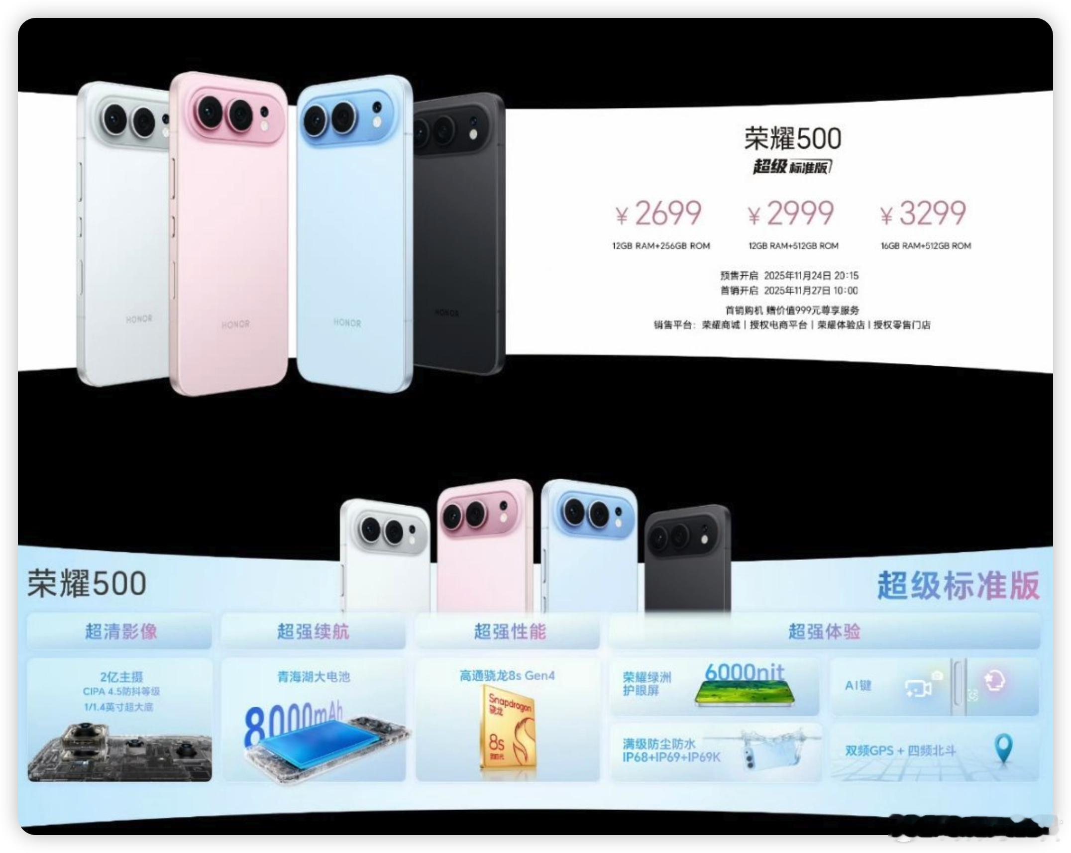 荣耀500系列价格公布:标准版2699元起/Pro版3599元起,各位感觉这价格怎么样?能不能扛起销量大旗。