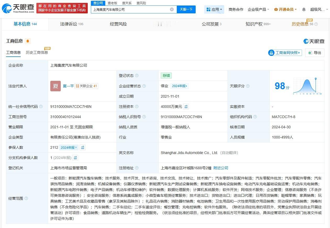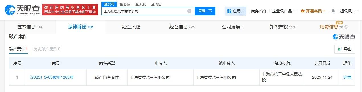 极越汽车关联公司申请破产 上海集度汽车公司申请破产审查 天眼查天眼风险信息显示,11月24日,极越关联公司上海集度汽车有限公司新增一则破产审查案件,申请人为该公司,经办法院为上海市第三中级人民法院。 该公司成立于2021年11月,法定代表人为夏一平,注册资本4亿美元,经营范围包括新能源汽车整车销售、汽车零部件及配件制造、汽车零配件批发、电动汽车充电基础设施运营等。股东信息显示,该公司由集度汽车(香港)有限公司全资持股。据媒体报道,去年12月,极越汽车陷入资金链断裂、供应商公开追讨欠款等事件,引发多方关注。 天眼查信息: