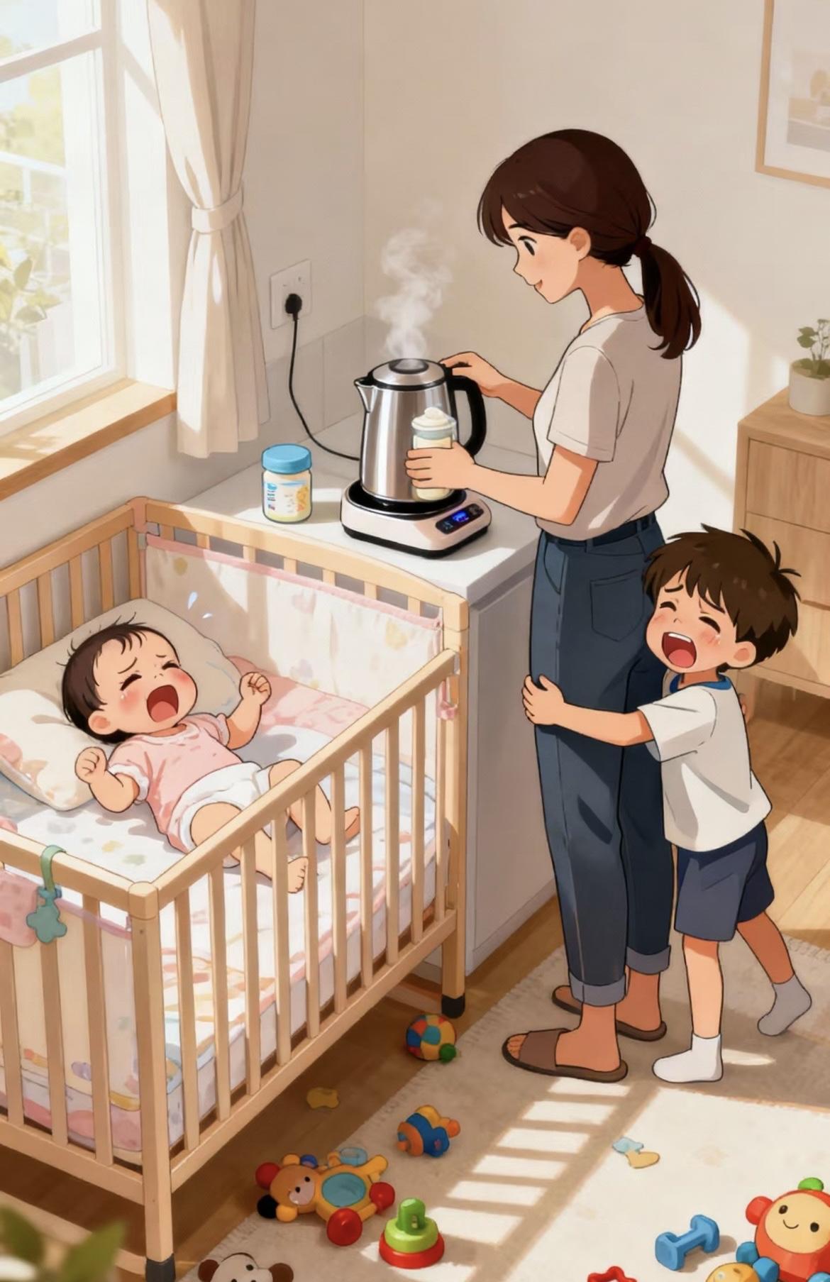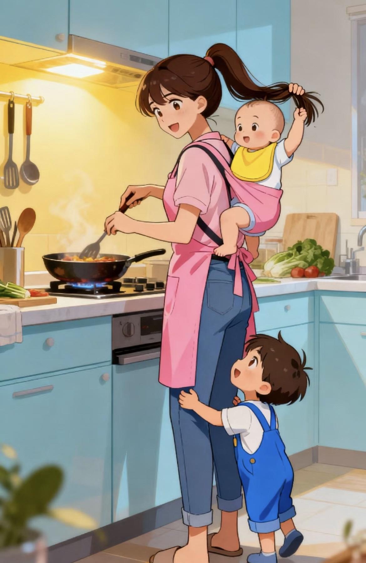 “ 带俩娃的一天:冲奶被薅头发,做饭绑后背,夜里连喘口气都怕吵醒娃 早上七点的闹钟还没来得及响,我已经被“二重奏”炸醒了——小的躺婴儿床里扯着嗓子哭,老大扒着我裤腿,眼泪糊一脸喊“妈妈抱”。 刚烧开的水溅了指尖,顾不上疼,左手攥着奶瓶摇奶温,右手得把扒我裤腿的老大往边上拢。奶刚冲好,小的哭岔了气,老大突然抱我腰晃,溅出来的奶洒了我一胳膊,黏糊糊的。 中午想炒个热菜,后背绑着刚哄好的老二,锅铲刚掂起来,他小手“啪”地薅住我马尾辫,疼得我一哆嗦。脚边老大拽着围裙角喊“要吃饼干”,油星子溅到胳膊上,我只能咬着牙翻菜。 到了夜里更热闹:老二刚蜷在枕头上睡沉,老大突然抢我手机哭着要听儿歌,刚点开音量键,老二眉头一皱嘴就撇起来——我连气都不敢喘,赶紧把手机塞老大手里,另一只手拍着老二的背,僵在床边动都不敢动。 别人总说“当妈后自带超能力”,哪是什么超能力啊,是硬扛:扛着睁不开的困意、扛着手忙脚乱的狼狈、扛着连口热饭都吃不上的日子。可低头看俩娃皱着眉哭的小脸,再抬头看他们睡着时软乎乎的脸蛋,又觉得这乱糟糟的日子里,裹着点甜 ”[笑哭][笑哭]