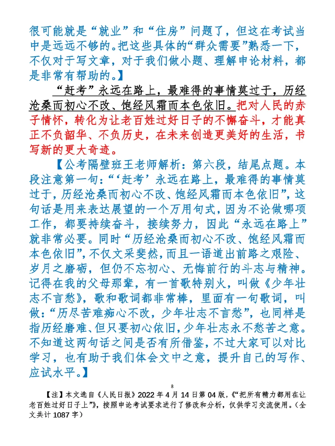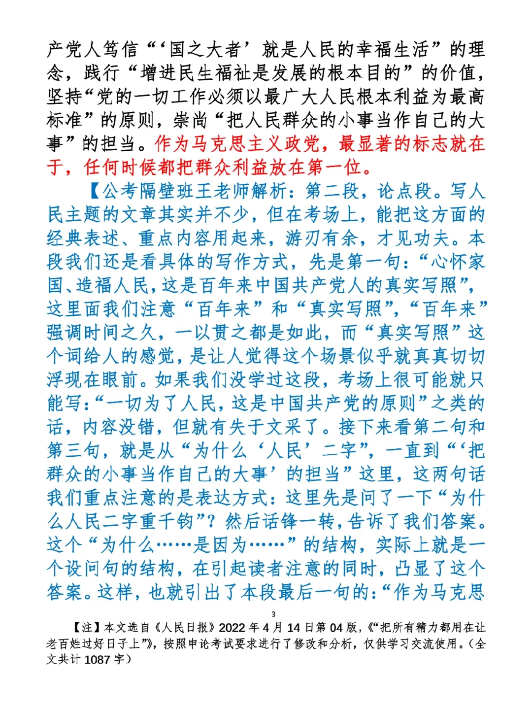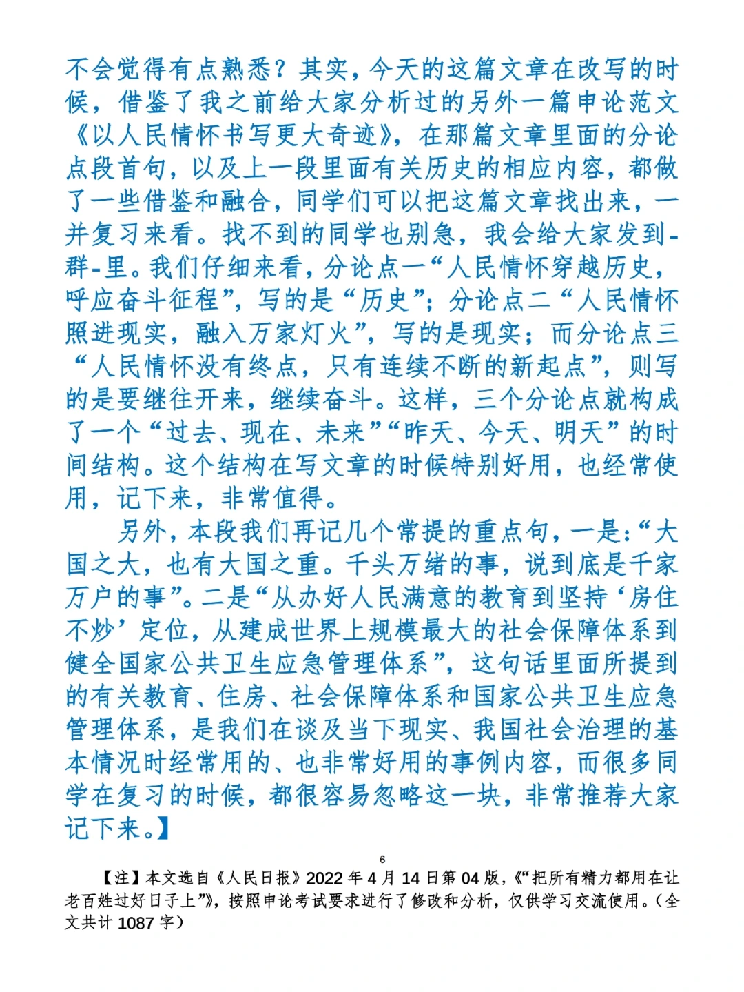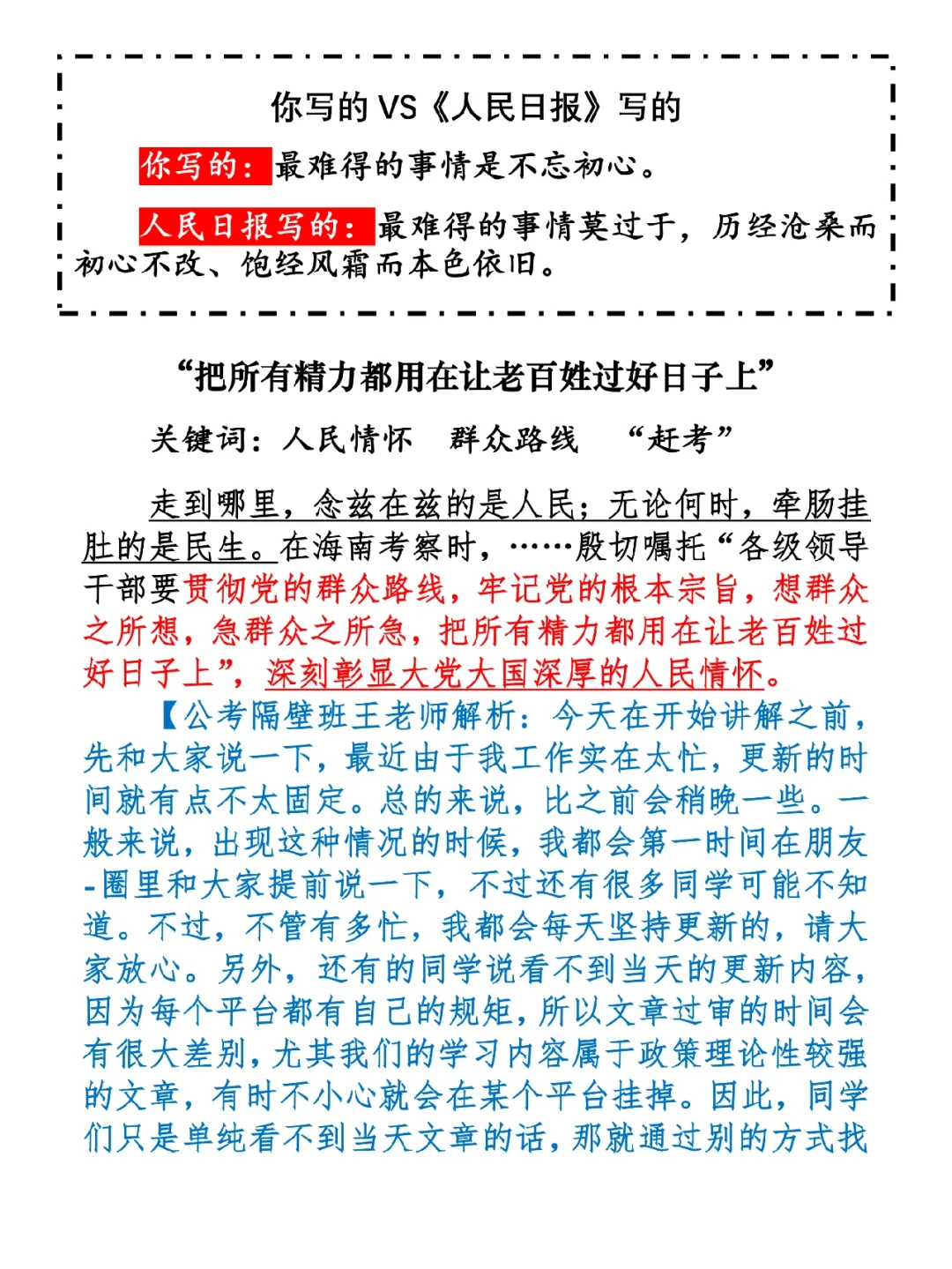1.如何抄写:每天的抄写文章以图片形式发在“公考隔壁班王老师”账号,红色字是重点句和结构句,黑色字是正文,蓝色字是解析,大家抄写时不必抄蓝色字。建议先通读全文(包括蓝色解析部分),做到心中有数再开始抄写,效果会更好。 2.关于文章:抄写文章来源于人民日报,但每篇文章我都根据申论考试要求进行了修改,主要集中在四个方面:一是重写或修改开头、结尾;二是统一段首句句式结构;三是调整段落字数,使文章结构更均衡;四是简化复杂长难句,使之更具可模仿性。每篇文章修改幅度不同,无论修改多少,都是基于申论考试要求,毫无对人民日报文章品评之意。(此处致敬人民日报) 3.关于解析:我会在文章每段后面加一段蓝色字的解析,是我自己在抄写时的感悟,篇幅时间有限,不能面面俱到,但求重点突出。如果你有其他感悟,也希望能在评论里分享,我们相互学习、共同进步。 ⭐️ ⭐️ ⭐️ ⭐️ ⭐️ ⭐️ 这里是公考隔壁班王老师独创的“每天半小时 申论80分”抄写团,欢迎加入我们!