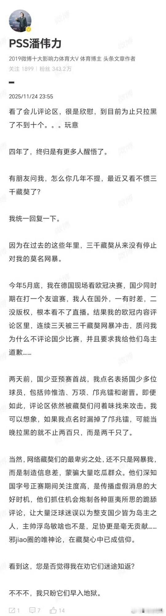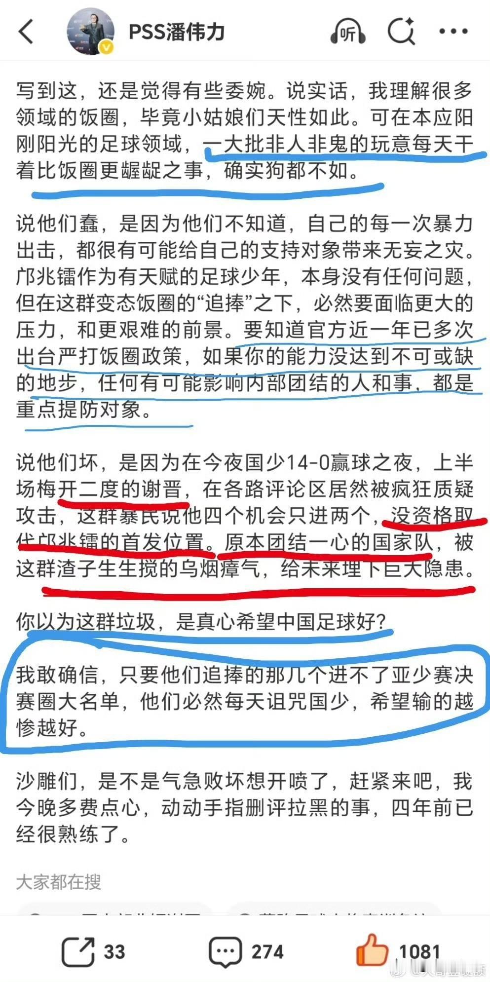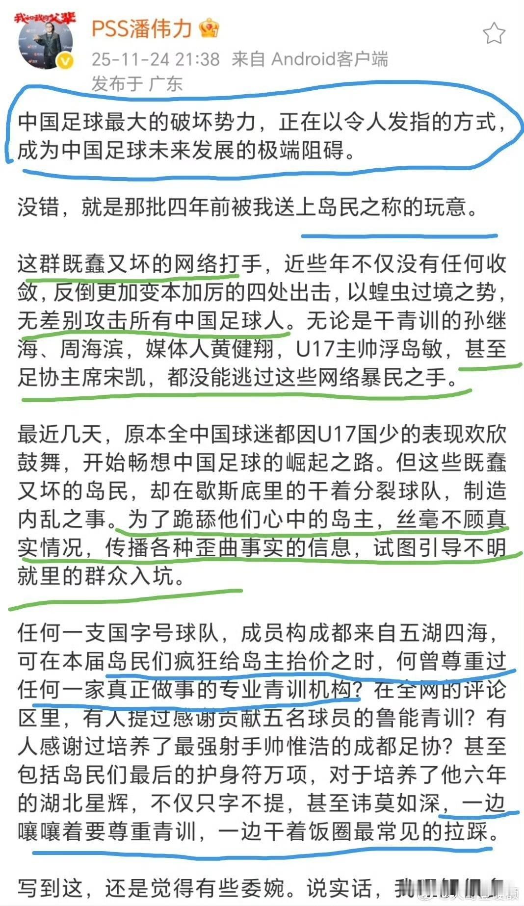 火力全开!媒体人潘伟力,两度炮轰董路粉丝,直接划为“变态饭圈”[灵光一闪] 北京时间11月24日晚,在U17国少队14:0大胜东帝汶U17队之后,知名足球媒体人潘伟力,在其个人社交媒体上发文,剑指董路粉丝,将其定义为中国足球最大的破坏势力,是中国足球未来发展的极端阻碍[打call] 潘伟力表示,这群岛民,这些网络打手,近些年变本加厉无差别攻击所有中国足球人,孙继海、周海滨,黄健翔,浮岛敏,甚至是足协主席宋凯,都没能逃过这些岛民之手…… 这些岛民干着饭圈的拉踩,疯狂给岛主抬价,为了跪舔他们岛主,丝毫不顾真实情况,传播各种歪曲事实的信息,不尊重过任何一家真正做事的专业青训机构,在全网评论区里,没人提过感谢贡献五名球员的鲁能青训,没人感谢过最强射手帅惟浩的成都足协,也没人感谢过培养万项六年的湖北星辉[流泪] 潘伟力认为,这些岛民每天干着比饭圈更龌龊的事儿,邝兆镭在这群变态饭圈的“追捧”之下,未来要面临更大的压力和更艰难的前景[流泪] 而最令潘伟力愤慨的是,今晚大放异彩的谢晋,却被饭圈喷成没有资格取代邝兆镭的首发位置,原本团结一心的U17国少队,被饭圈文化搅的乌烟瘴气,给U17国少队的未来埋下巨大隐患[流泪] 不得不说,在这个U17国少队14:0大胜之夜,潘伟力这番炮轰,直接剑指董路粉丝,措辞严厉超乎想象,并将这些岛民直接划为“变态饭圈”,这或许就是传递出一个信号,中国足协打击足球青训饭圈的行动,可能即将开始了……