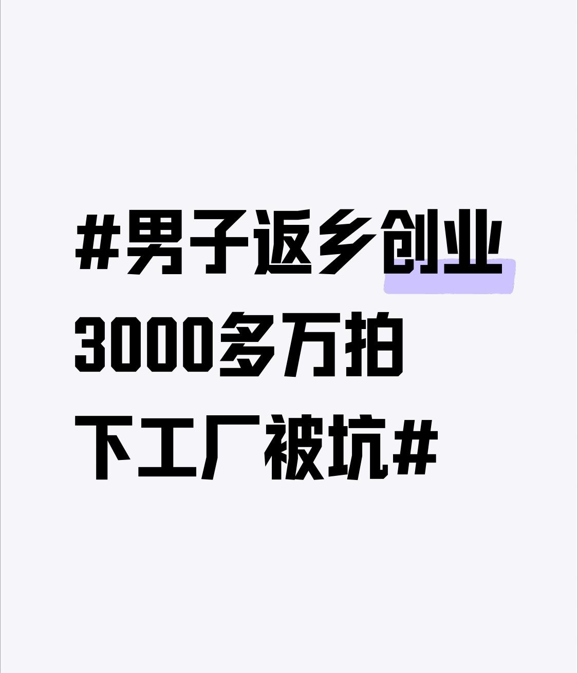 男子返乡创业3000多万拍下工厂被坑 最近看到个新闻,一男子返乡创业,花3000多万拍下工厂,结果被坑惨了。男子本想着回乡发展,为家乡做点贡献,这勇气可嘉。谁能想到,花大价钱拍下的工厂,竟是个“烫手山芋”。可能是在竞拍时没把情况摸清楚,也或许是遇到不良卖家使坏。3000多万可不是小数目,对普通人来说,这得打多少年工啊。这也给想创业的人提了个醒,不管啥时候,投资前一定要做好充分的调查,别被表面的东西迷惑,不然辛苦攒下的钱就打水漂了,太闹心!