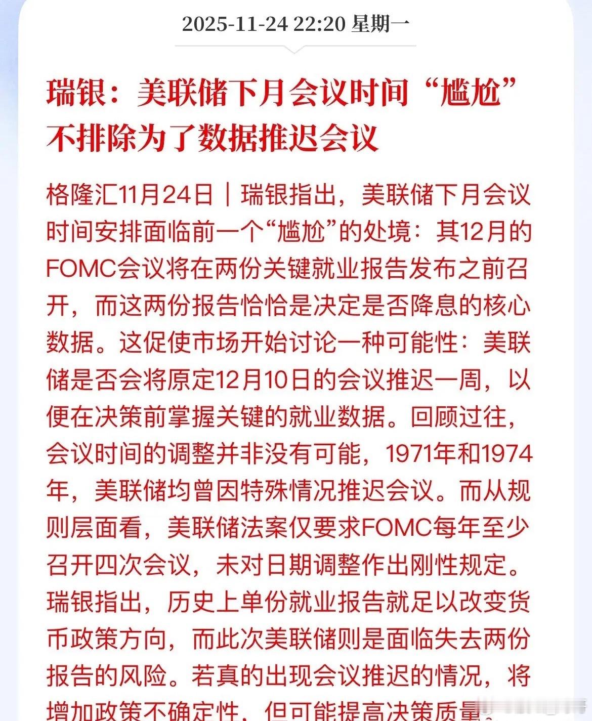 美联储下个月会议的时间要推迟了?瑞银表示美联储下个月会议时间处于一个比较尴尬的时间节点。毕竟10月非农数据和11月份非农数据要在12月中旬才公布,而美联储会议是12月10日,两份非农数据正式决定美联储是否采取降息行动的关键,在缺乏关键数据的美联储,会不会把会议推迟一周,在12月16日非农数据发布之后再召开会议,毕竟这也是有前例的,在1971年和1974年也是把会议推迟一周,1971年是因为越南战争的相关抗议活动而推迟,1974年是因为要配合国际会议日程,而此次12月份的美联储会议会不会因为关键性数据而决定推迟一周呢,毕竟现在美联储一会说要降息,一会说不降息,在缺少数据的背景下,美联储内部分歧加剧。