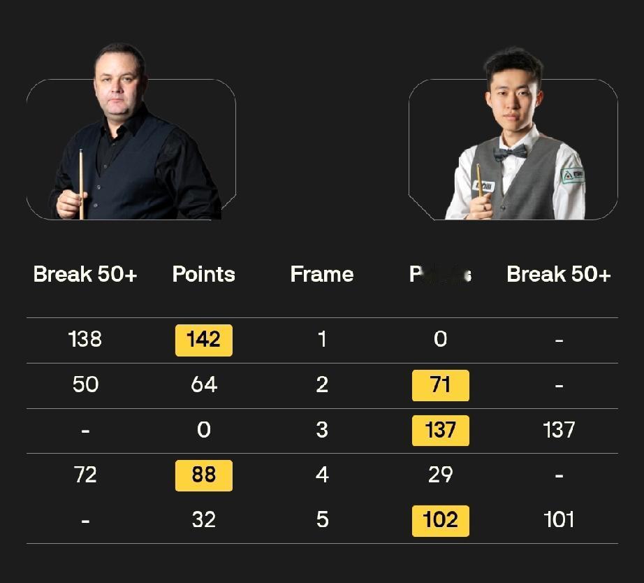 常冰玉 3-2 斯蒂芬·马奎尔 袁思俊 3-1 辛格·查达 吕昊天 1-4 马修·史蒂文斯 11月25日,斯诺克英锦赛资格赛第三轮,常冰玉、袁思俊发挥不错,领先斯蒂芬·马奎尔和辛格·查达。吕昊天形势危急,大比分落后马修·史蒂文斯。