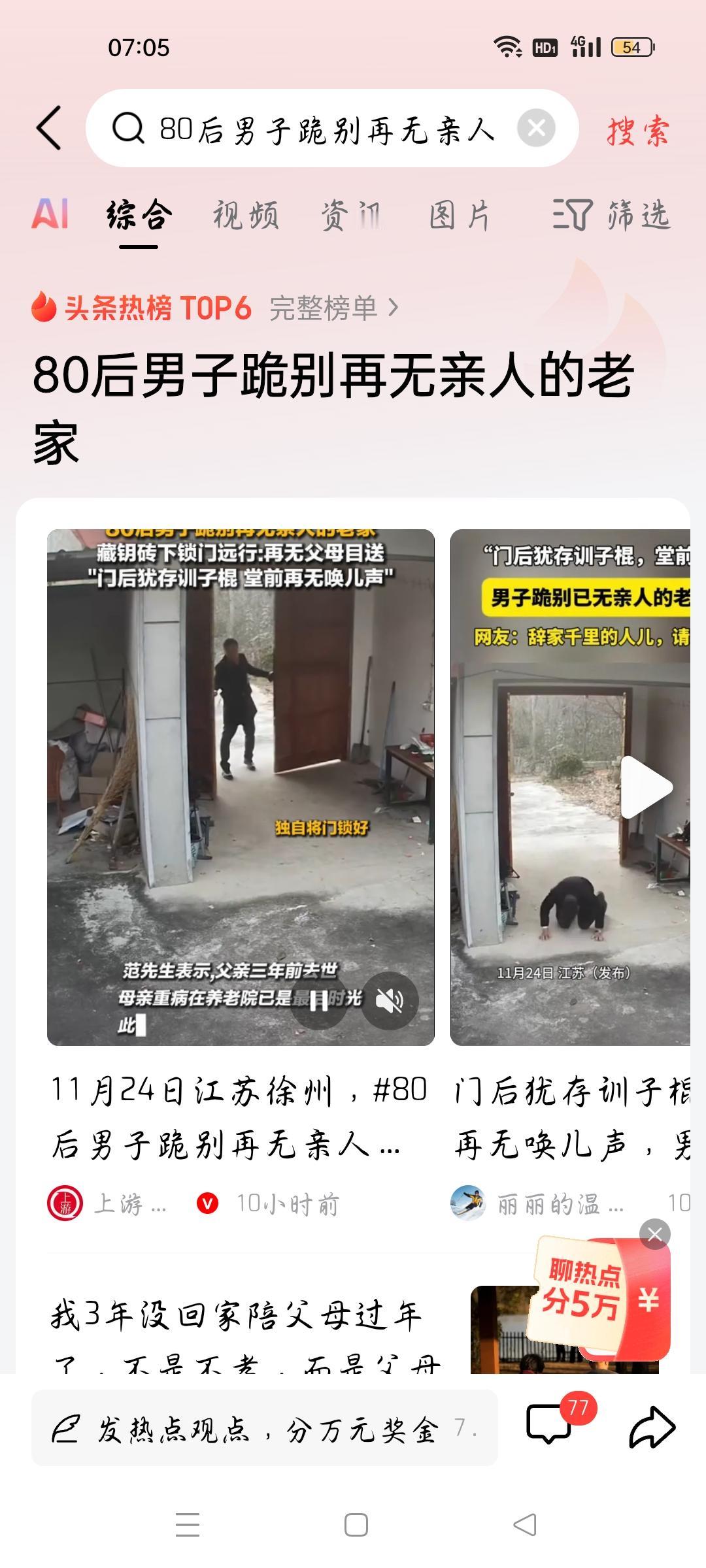 80后男子跪别再无亲人的老家,我想说 据上游新闻报道,11月24日江苏徐州,80后男子跪别再无亲人的老家,视频一出,引起了许多中年人的共鸣,父母在,老家还是温暖的地方,回来有人招呼,满满地亲情,出去时有父母的送别,有父母的叮嘱,现在是“门后犹存训子棍,堂前再无唤儿声",冷清了,唉!人生就是如此,有父母,还有牵挂,无父母,只剩下思念,老家也就是记忆,回家的时候越来越少了。各位条友觉得呢?