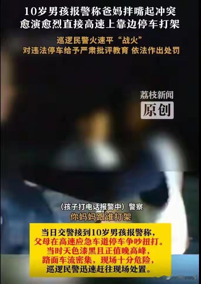这孩子将来能干大事!眼看局面无法控制,关键时刻打给警察叔叔,好好地给这对夫妻上了一课。 近日,京沪高速路段出现了一次险情,一个只有10岁的孩子给警局打去电话,孩子说,自己的爸爸妈妈正在高速公路上打架,自己不知道怎么办,请求警察叔叔过来帮忙。 接警后,因为正值周六出行高峰,当时又是晚上,在高速上打架可是十分危险! 虽然孩子并没有清晰说出具体位置,好在高速民警通过技术手段,没多久就锁定了车辆位置。 民警赶到现场,有辆车正停在了京沪高速下行线903公里的应急车道位置。看着高速上的车来车往,当时的两人还在争辩和打架,并没有因为民警的到来而收敛。 这铁定太危险了,民警迅速设置警示后,只能第一时间强行将两人分开。并将这一家人从附近的高邮收费站带离,移交给当地警局进行调解。 由此,为何要当着孩子的面打架,总算弄明白个七七八八。 当天晚上,丈夫喝了酒,后来是妻子在开车,孩子坐在后面,两人说着说着就上劲了,不仅吵起来,进而还开始了动武。 结局是经过民警的调解,两人都认识到了错误,并接受了相对应的处罚。 虽说事件的结局不算太坏,但该事件却也给大家带来了一些警示: 1、因为吵架把汽车停在应急车道,本身就错了!应急车道只有在车子有突发状况、或者人员疾病等特殊情况才能停靠。 2、两人为了琐事,居然在高速上大打出手,也算是难得一见,而丈夫喝了酒也绝对不是不冷静的理由。学会如何控制情绪,才能更好地守住家人的安全。 3、孩子的清醒,给父母上了一课,不仅避免了矛盾升级,更可能阻止了一次悲剧的发生。 4、当着孩子的面打架,让孩子成了旁观者,真的太不妥了。 家庭本来是孩子的避风港,而这两人自顾自的冲动鲁莽,又会给孩子带来什么伤害呢? 大家怎么看这件事?