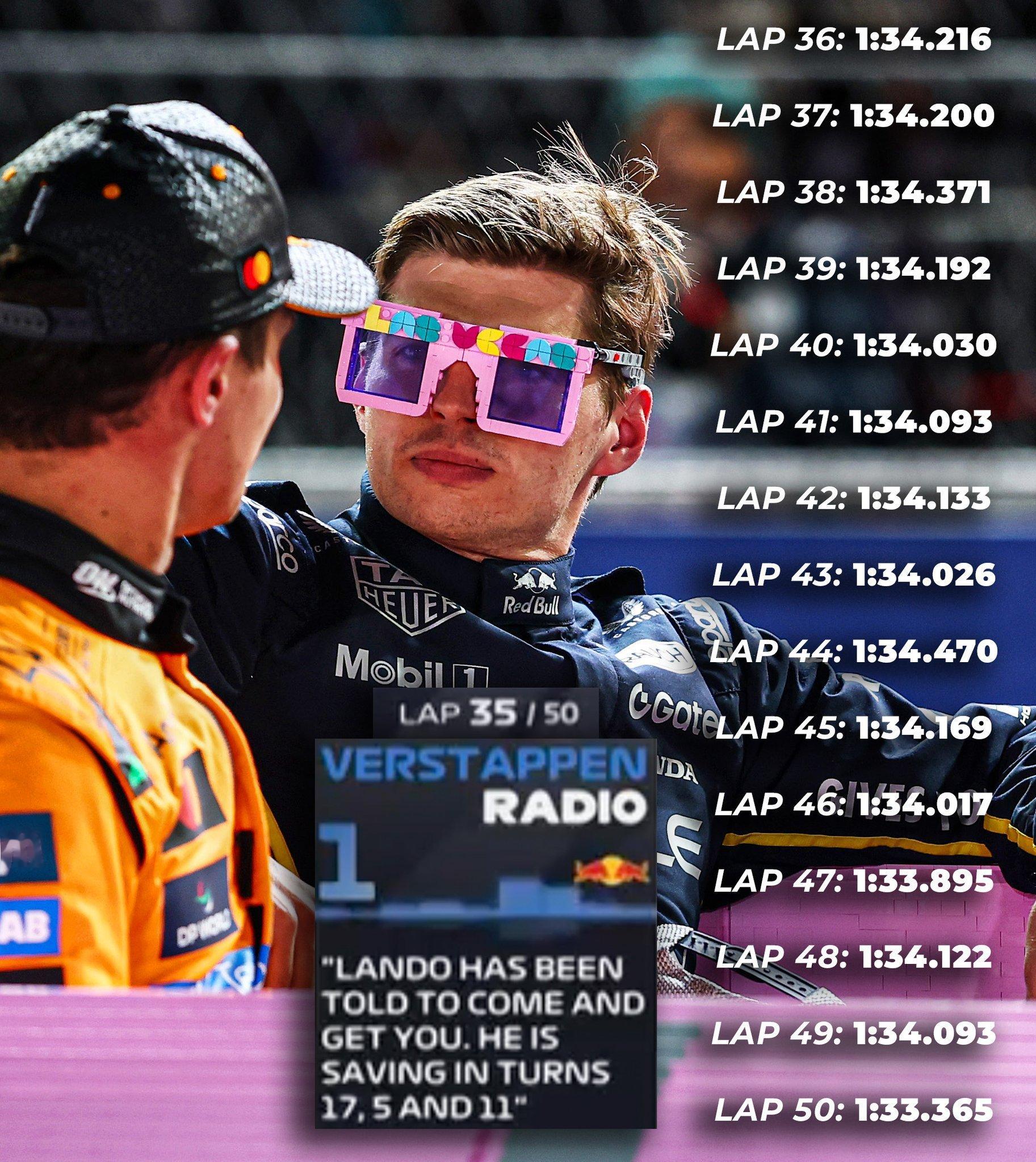 第35圈GP告知维斯塔潘,诺里斯接下来目标是超越你,他在场上立马做出了强有力地回应。