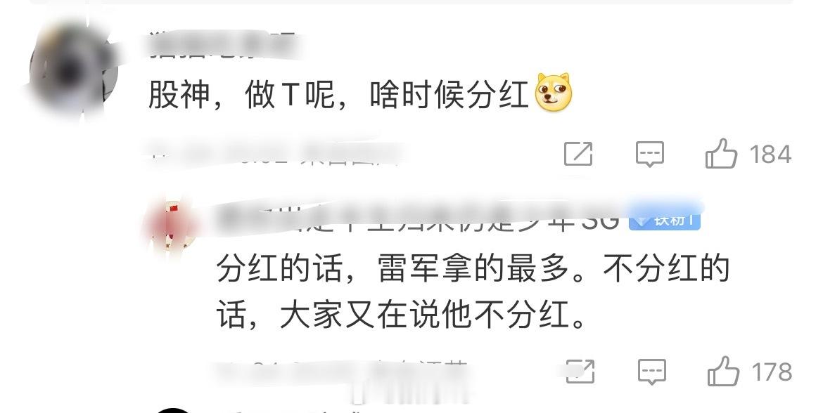 一些人真是左右脑互搏,雷总个人增持小米,说小米不分红,真要是分红了,雷总又拿大头,这些人乐意吗?还有人说雷总抄底的,既然你觉得小米股票到底了,没人拦着你买。