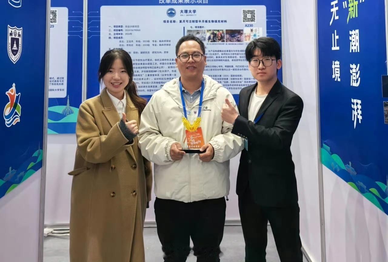11月21日至23日,第十八届全国大学生创新年会在南京大学举办。由该校昆虫生物医药研究院办公室主任刘衡副研究员指导,大理大学药学院2023级临床药学班的王冠杰和李高欢申报的《复月可注射型半月板生物填充材料》国创项目成功入选此次年会改革成果项目,并由公众票选为“我最喜爱的项目”,实现了大理大学在该奖项上零的突破。