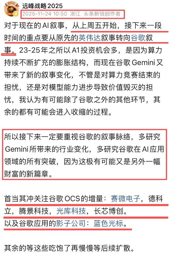 接下来的重头戏依旧是拥抱谷歌链条,其中的OCS依旧是当下的重中之重。谷歌的 TPU是其 AI 算力的核心。虽然名为“自研”,但实际运作模式是谷歌负责前端逻辑设计。英伟达在大模型训练中推崇 InfiniBand 网络,而谷歌坚持使用以太网。 但就这两年AI发展的趋势而言,英伟达的Blackwell依旧会是绝对核心,所以过去一轮不管是美股还是A股都是英伟达相关的产业链为引领。 但以我对整个产业趋势的理解,在2028年后,谷歌的模式将会是终局。 资本市场永远会比现实更早地去演绎整个过程,就比如当下,上个礼拜从英伟达链切换到谷歌链应该是非常及时的。 观点依旧是过去的观点: 首当其冲关注谷歌OCS的增量:赛微电子,德科立,腾景科技,光库科技,长芯博创。 以及谷歌应用的影子公司:蓝色光标。 其余的等这些吃饱了再慢慢等后续扩散。