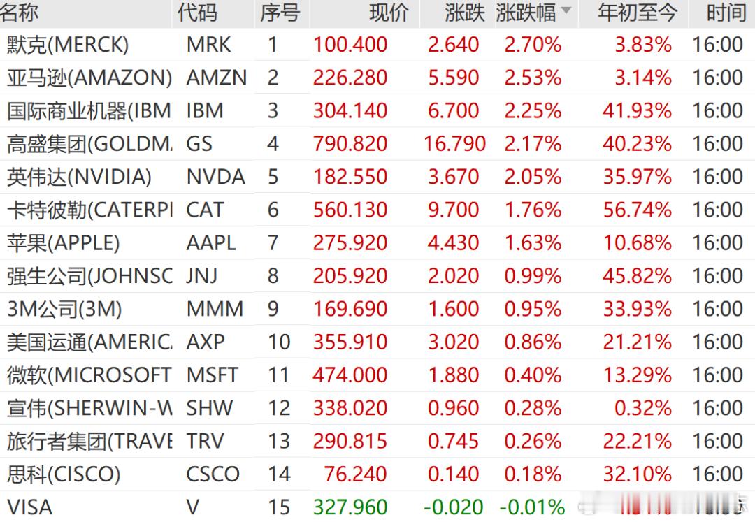 默克涨2.70%,亚马逊涨2.53%,IBM涨2.25%,领涨道指成份股。