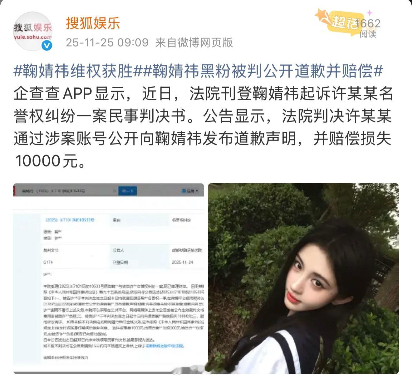 恭喜鞠婧祎维权成功,黑粉要公开道歉并赔偿。支持小鞠维护自己的合法权益。