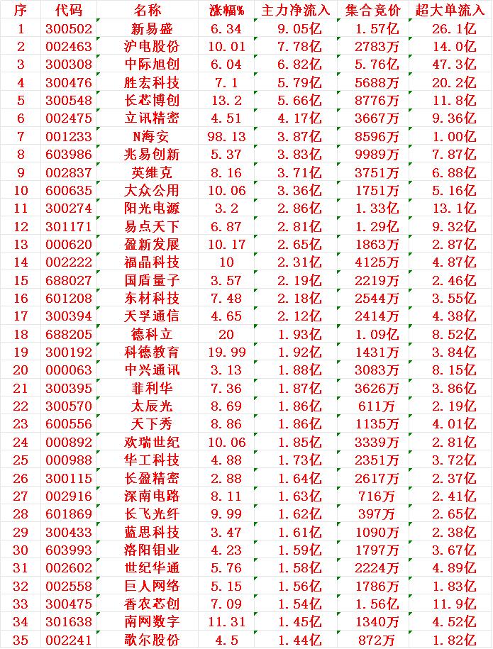11月25日开盘45分钟,主力资金“买入的 ”的35名单一览! 新易盛:净流入 9.05亿元 沪电股份:净流入 7.78亿元 中际旭创:净流入 6.82亿元 胜宏科技:净流入 5.79亿元 长芯博创:净流入 5.66亿元