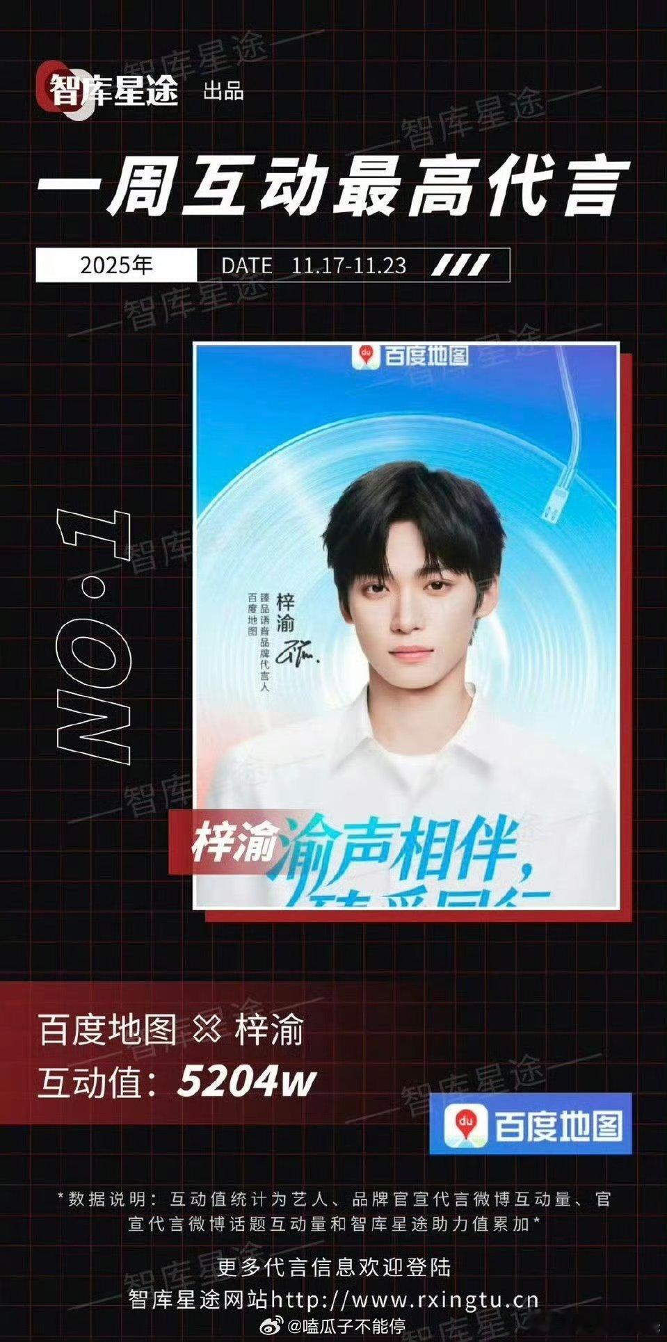 本周互动值最高代言🏆百度地图和代言人梓渝 ,梓渝粉丝的实力有目共睹,梓渝的商业价值前途无量🔥!