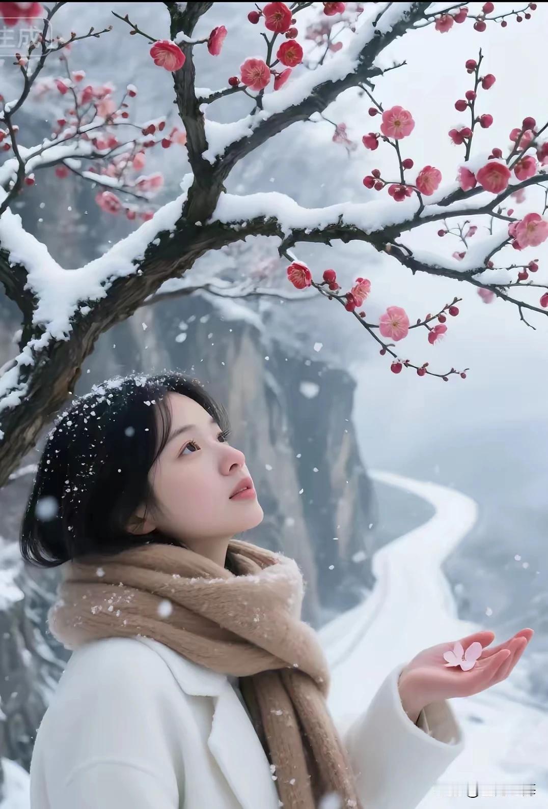 梅雪初晴映红妆 佳人含笑倚梅旁 素手轻捧花一朵 传来淡淡一缕香。