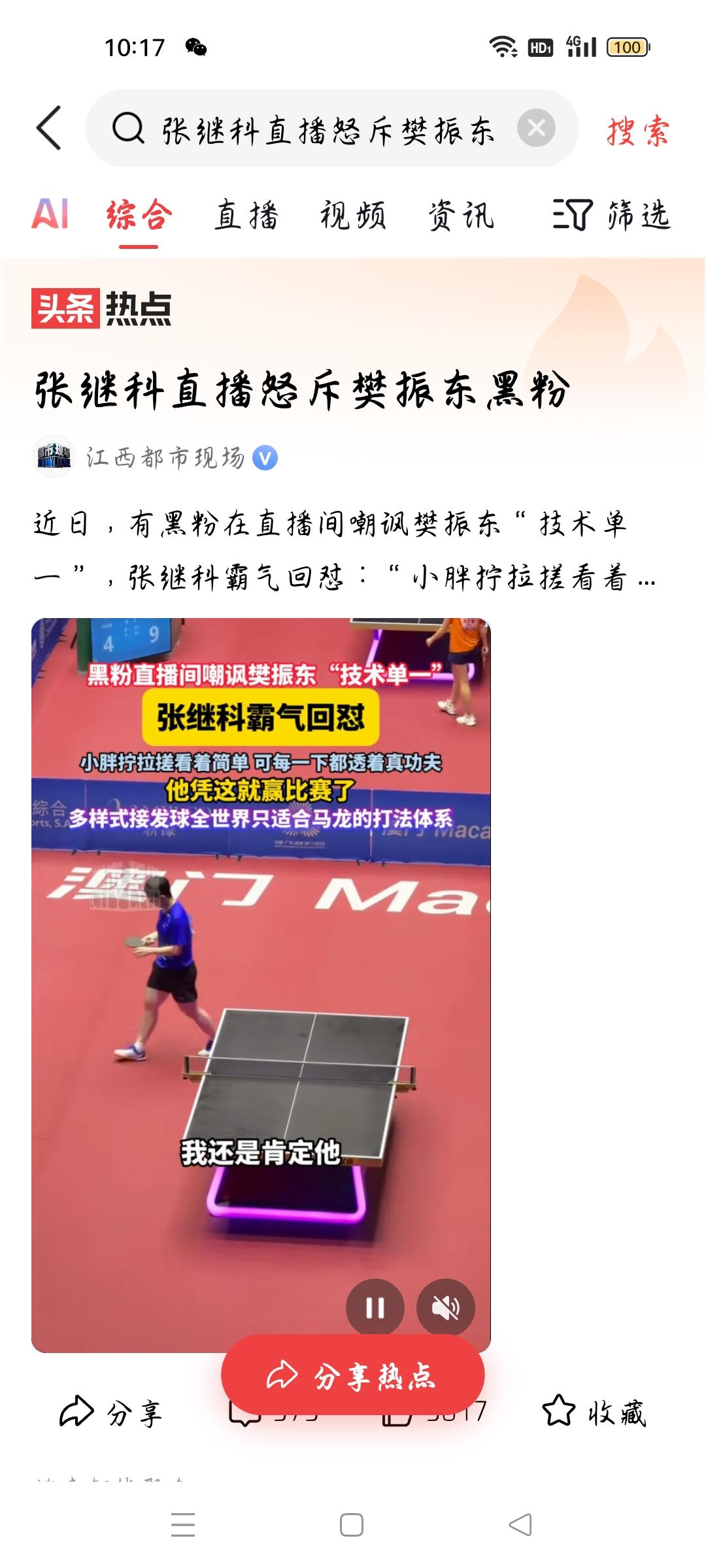 张继科直播怒斥樊振东黑粉,我想说 据江西都市现场报道,近日,有黑粉在直播间嘲讽樊振东“技术单一",张继科霸气回怼:"小胖拧拉搓看似简单,可每一下都透着真功夫""他就凭这赢得了比赛",我想说,黑粉嘲讽樊振东是因为不懂樊振东,俗话说,外行看热闹,内行看门道。张继科是打乒乓球的,他能看懂图纸,力挺樊振东。有人说,同行是冤家,可是张继科不是这样,是英雄惜英雄,力挺樊振东。咱们要为樊振东点赞,也要为张继科点赞。各位条友觉得呢?