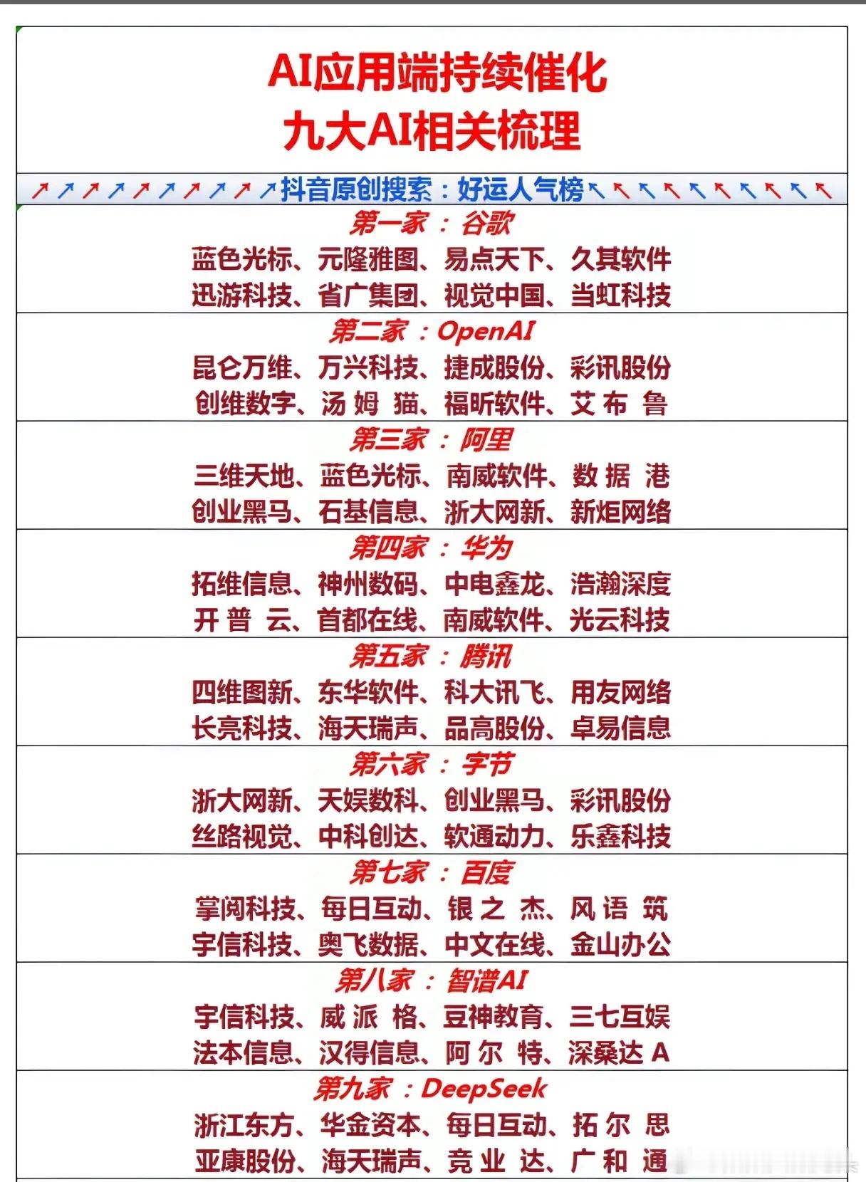 AI应用端的“生态蛋糕”怎么分?九大巨头的合作版图藏着谁的翻倍机会?当AI从“实验室技术”转向“全民应用”,九大巨头的生态合作网,正成为A股应用端企业的“业绩加速器”——这张覆盖谷歌、OpenAI、华为等玩家的合作清单,藏着2025年最确定的增长逻辑。谷歌阵营里,蓝色光标靠AI营销拿下超80亿品牌订单(同比增240%),视觉中国的AI生成素材库接入谷歌搜索后,版权收入月均涨1.2亿;OpenAI的伙伴昆仑万维,其AI翻译工具“天工”付费用户破300万,万兴科技的AI剪辑软件占据海外短视频工具市场30%份额。更值得关注的是“多阵营卡位”的企业:蓝色光标同时绑定谷歌、阿里,彩讯股份覆盖OpenAI与字节,这类企业能吃到多平台的流量与订单红利。华为生态中的拓维信息,昇腾AI服务器交付量占全国45%,光云科技的AI电商工具已服务超200万商家;百度伙伴金山办公,其AI文档助手“WPS AI”付费转化率达18%,远超行业平均的5%。当前AI应用端的估值仅为算力板块的1/4,但业绩弹性更明确:随着大模型付费率从5%向25%渗透,这些“生态卖水人”的收入增速将在2025年突破50%。毕竟,AI的商业价值最终要靠“谁能帮巨头把技术卖向市场”来兑现——而这张合作清单,就是最直接的“寻宝图”。