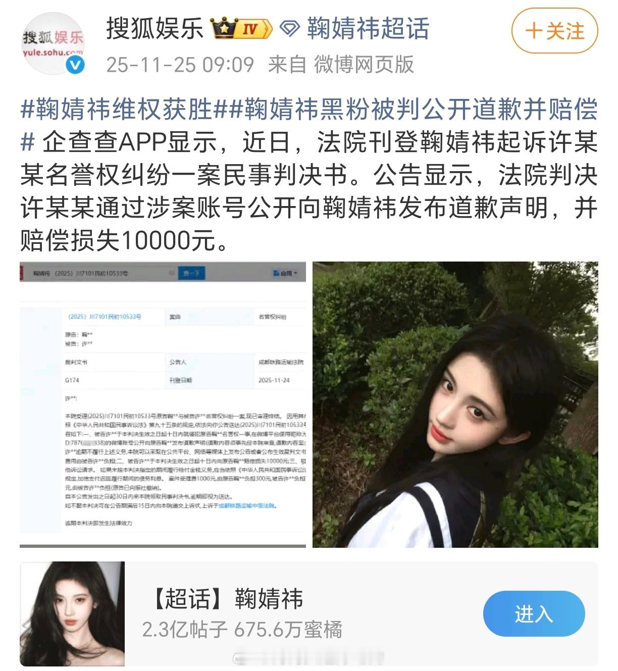 鞠婧祎告黑胜诉!黑粉公开向鞠姐道歉并且赔偿!互联网非法外之地,支持鞠婧祎维权!