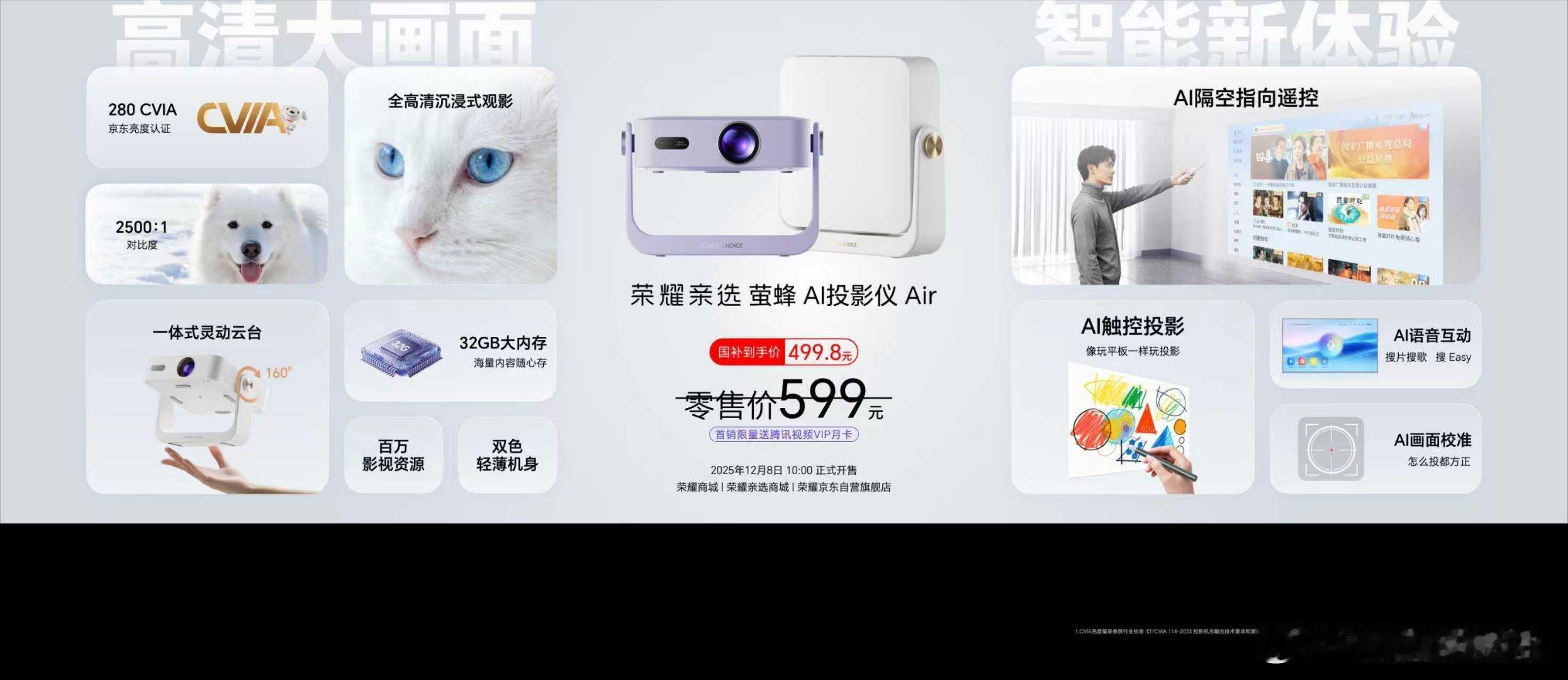 荣耀亲选萤蜂Al投影仪Air,拥有超高亮度和对比度,更亮更清晰,搭载AI触控黑科技,也可以像平板一样操控,点得准,更玩得爽!11月27日10:00首销价格599元,国补到手价499.8元。
