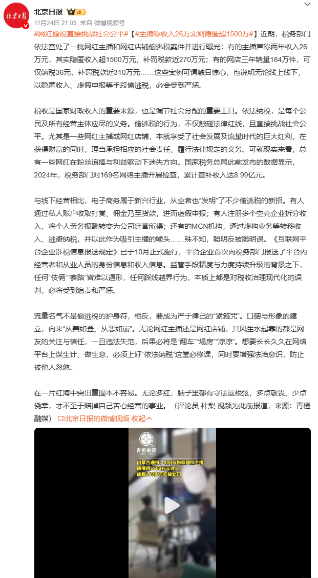主播郭鑫鑫偷税被罚,三年隐匿超1500万收入,仅申报26万。直播间里“已拍”“求补货”热闹非凡,税务申报却冷冷清清。享受流量红利,就要承担社会责任,偷逃税款挑战法律红线,必将受到严惩!