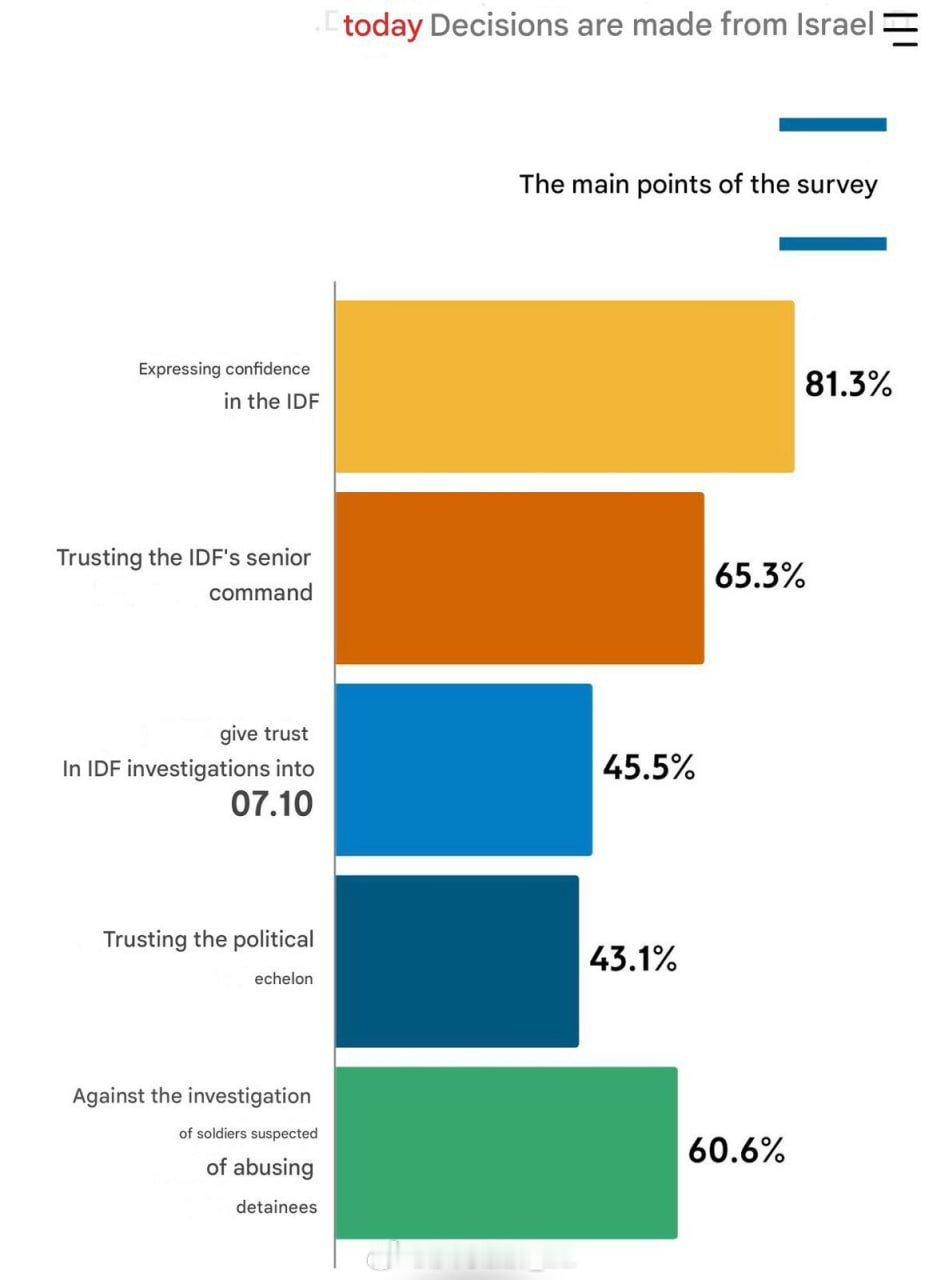 “以色列民主研究所”的一项最新民意调查显示,60.6%的以色列人反对调查以色列士兵在集中营强奸巴勒斯坦人质的事件,而65%的以色列人认为以军不应该在军事行动中避免平民伤亡。