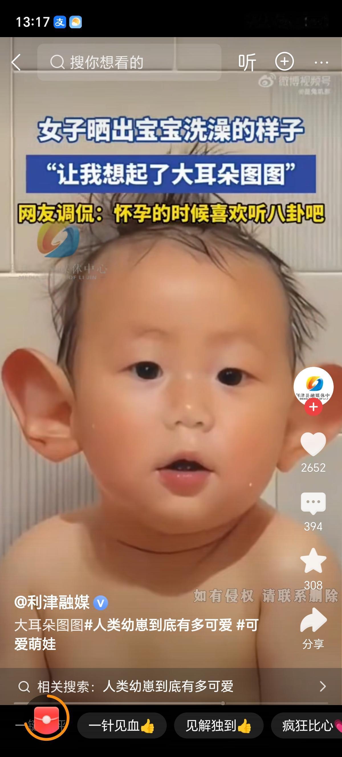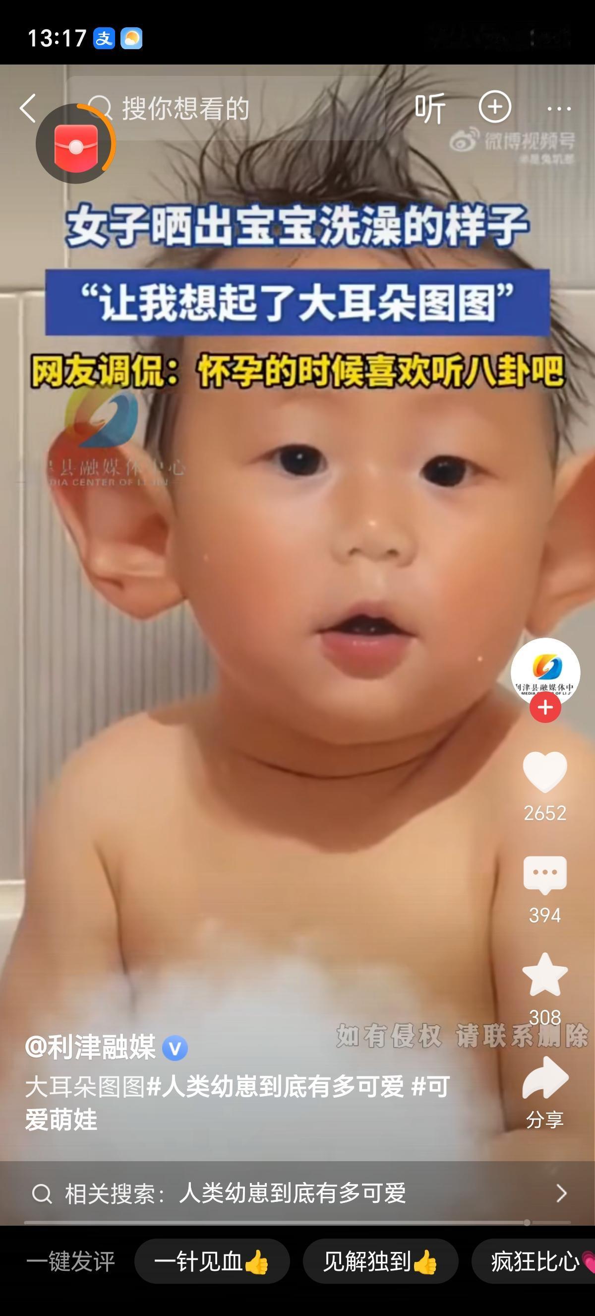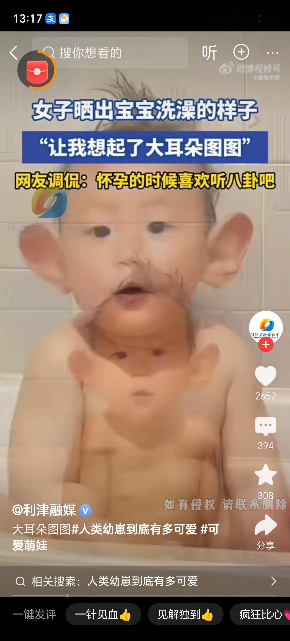 人类幼崽到底有多可爱?万万没想到能看见现实版的大耳朵图图,这个洗澡的宝宝简直是“大耳朵图图本图”!软乎乎的脸蛋配着支棱的大耳朵,湿发炸成小刺猬,圆眼睛懵懵盯着镜头,自带萌感。网友那句“怀孕时爱听八卦”更是精准戳中笑点,这小模样又呆又可爱,把“人类幼崽的萌”焊在了脸上~ 太可爱了,想抱回家,亲亲抱抱举高高!