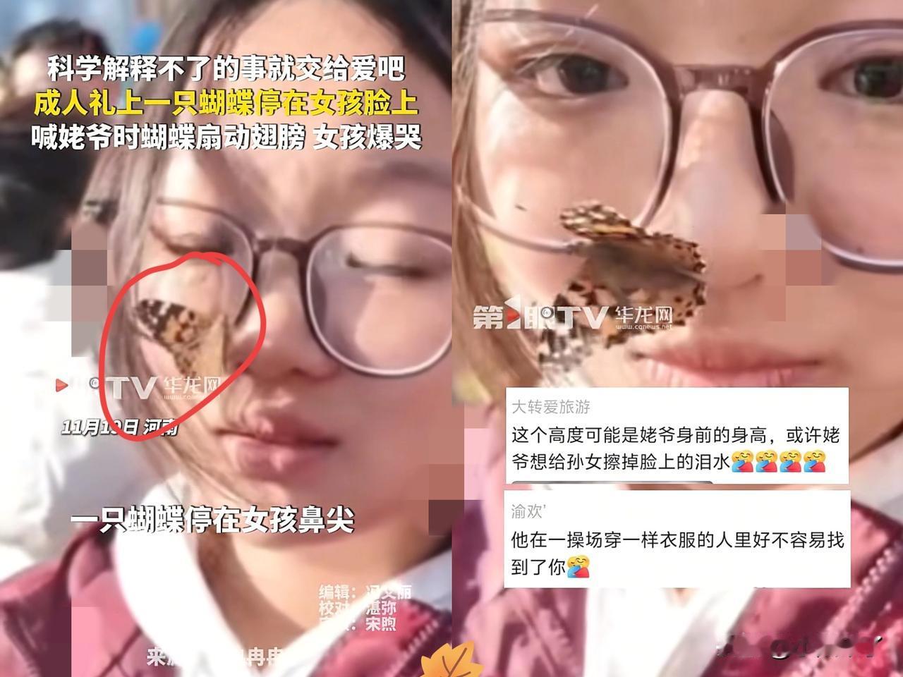 泪目了,女儿在学校举行成人礼时,突然一只蝴蝶飞到她鼻尖上,哽咽着问妈妈:“是不是姥爷来看我了?”妈妈的心猛地揪紧,强忍着泪水轻声试探:“是孩她姥爷吗?要是你就扇下翅膀好不好?” 话音刚落,那只蝴蝶真的轻轻扇动了翅膀,幅度温柔得像姥爷从前的抚摸,母女俩当场泣不成声! 姥爷走得太突然,没能亲眼见证孙女的成人时刻,这是女儿藏了好久的遗憾! 谁曾想,这份迟到的牵挂,会化作一只蝴蝶,悄悄赴这场跨越生死的约定! 蝴蝶停在女儿发梢久久不愿离去,扇动翅膀的节奏,像极了姥爷在耳边的叮嘱! 周围的老师同学都红了眼,原来最深情的思念从不是哭喊,而是在你最需要的时刻,以另一种方式悄悄降临! 那些离开的人,从来没有真正走远,只是换了种方式守护!