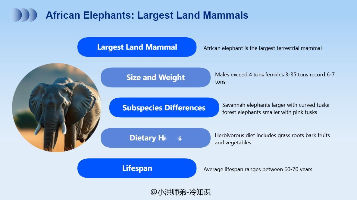 最大的陆生哺乳动物生活在陆地上的哺乳动物中,最大的要数非洲象了。成年雄性非洲象一般体重在4吨以上,雌性非洲象的体重也能达到3~3.5吨。人们曾经发现一头非洲公象,肩高3.5米,体重6~7吨,是有记载的最大的非洲象。按照生活地域的不同,非洲象可以分为非洲草原象和非洲森林象两种。生活在草原的非洲象一般重达6吨,耳朵大且下部尖,不论雌雄都长有长而弯的象牙。生活在森林的非洲象体形要小一些,身高2.5米,耳朵较圆,象牙较直且呈粉红色。非洲象也是最大的食草动物,它们的主要食物是草、草根、树皮、树芽、灌木、水果和蔬菜。非洲象的平均寿命为60~70岁。|||