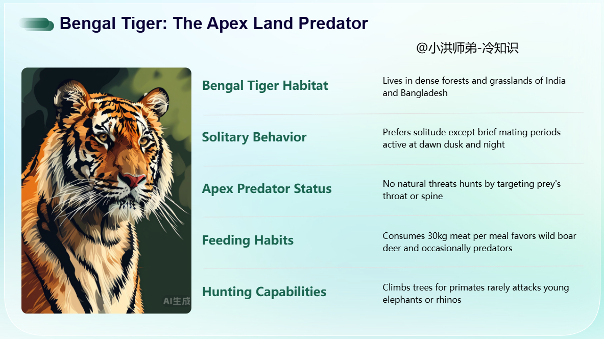 最凶猛的陆地哺乳动物孟加拉虎又叫“印度虎”,主要生活在孟加拉和印度。孟加拉虎一般生活在茂密的山林、灌木和野草丛生的地方。它们喜欢独来独往,一年中除了少量的时间和配偶在一起之外,绝大多数时间都是单独行动的。一般在早晨、黄昏和夜晚活动,白天则在丛林中休息。它们是陆地上最凶猛的动物,没有任何动物会对他们构成威胁。当孟加拉虎捕食的时候,它们会先瞄准猎物的咽喉,然后用强大的咬劲咬断较小动物的颈椎,或者让较大的动物窒息。孟加拉虎可以在一天内吃掉30千克的肉,然后在接下来的几天内不进食。它们最喜欢吃的食物是野猪、野鹿、野牛、白斑鹿、黑羚,有时候豹、狼、鬣狗等凶猛的动物也会成为它们的腹中餐。它们甚至能爬上树捕食灵长目动物,偶尔也会攻击小象和犀牛。|||