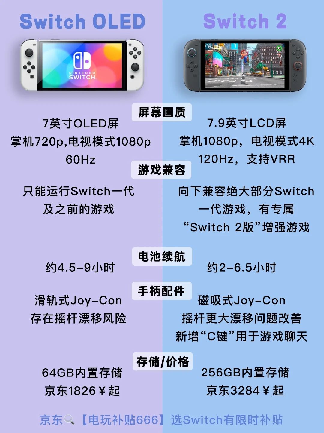如果你是Switch 深度玩家,一周至少有两三天会玩Switch游戏,并且居家客厅玩的多,经常会家庭游戏叫上好朋友面基一起玩,对游戏的体验和性能有更高追求,经常玩3A大作,希望看到更清晰的纹理、更远的渲染距离和更稳定的帧数,那Switch 2更适合你,毕竟随着时间的增加,Switch 2 的游戏生态也会更丰富,能低价抢到就是物超所值。
