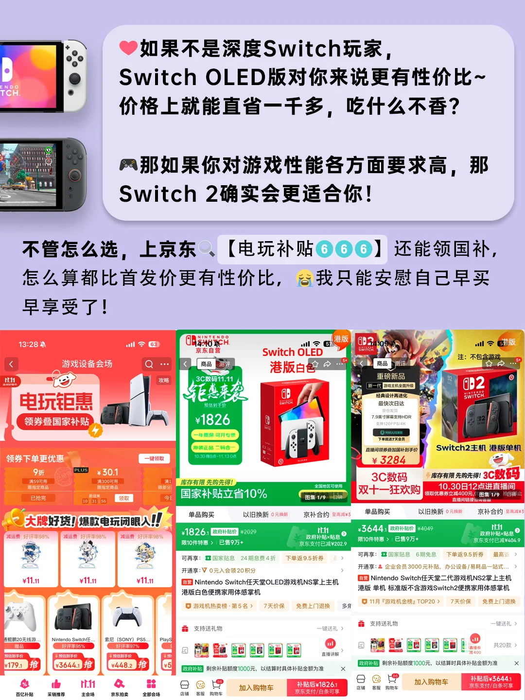目前京东🔍【电玩补贴666】,Switch OLED版和Switch 2都有国补,不管你的生活场景对应哪一款,当下都是一个不错的入手好时机。