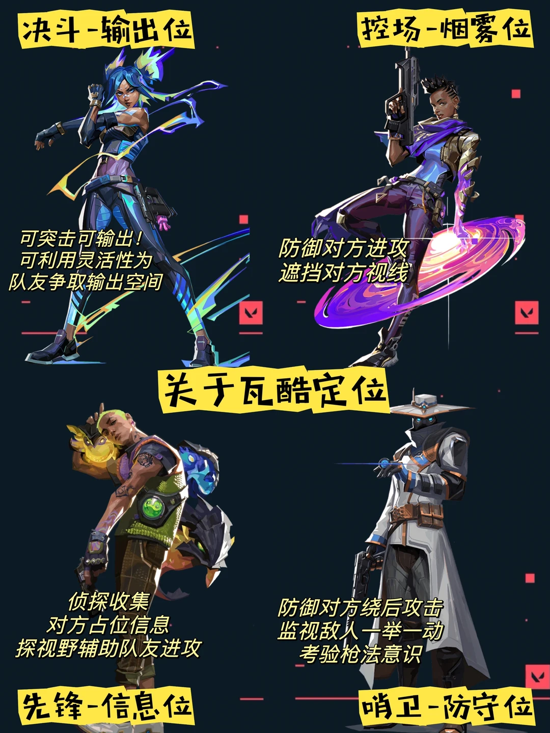 每位游戏的C/Q/E/大招技能均不同,玩家需要根据游戏地图在四大定位中选出合理的瓦阵容。