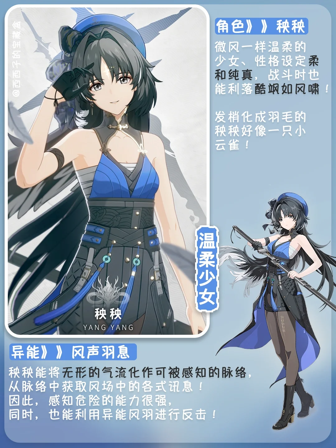 秧秧👉微风一样温柔的少女、性格设定柔和纯真,战斗时也能利落酷飒如风啸! 🕊️发梢化成羽毛的秧秧好像一只小云雀!