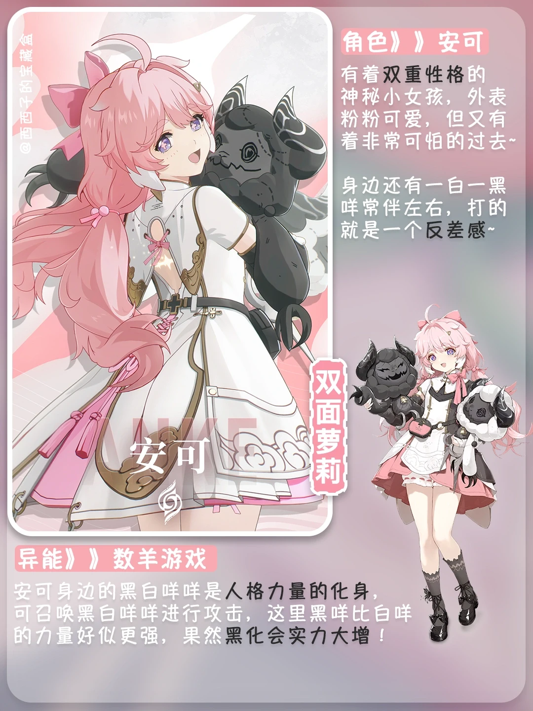 安可👉有着双重性格的神秘小女孩,外表粉嫩可爱,但好像有着非常可怕的过去,🐏身边还有一白一黑咩常伴左右,打的就是一个反差感~